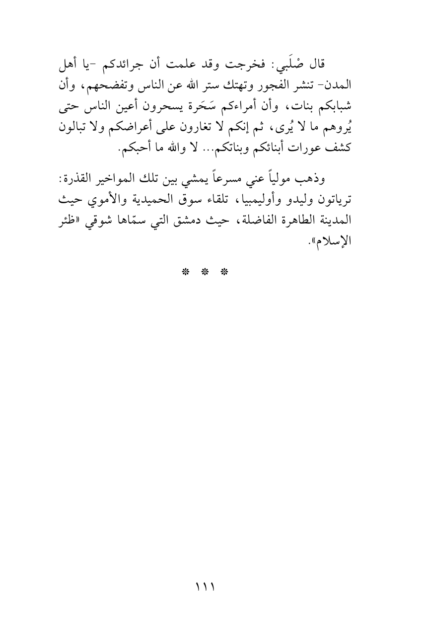 وذهب مولياً عني مسرعاً يمشي بين تلك المواخير القذرة: ترياتون وليدو وأوليمبيا، تلقاء سوق الحميدية والأموي حيث المدينة الطاهرة الفاضلة، حيث دمشق التي سمّاها شوقي «ظئر الإسلام».