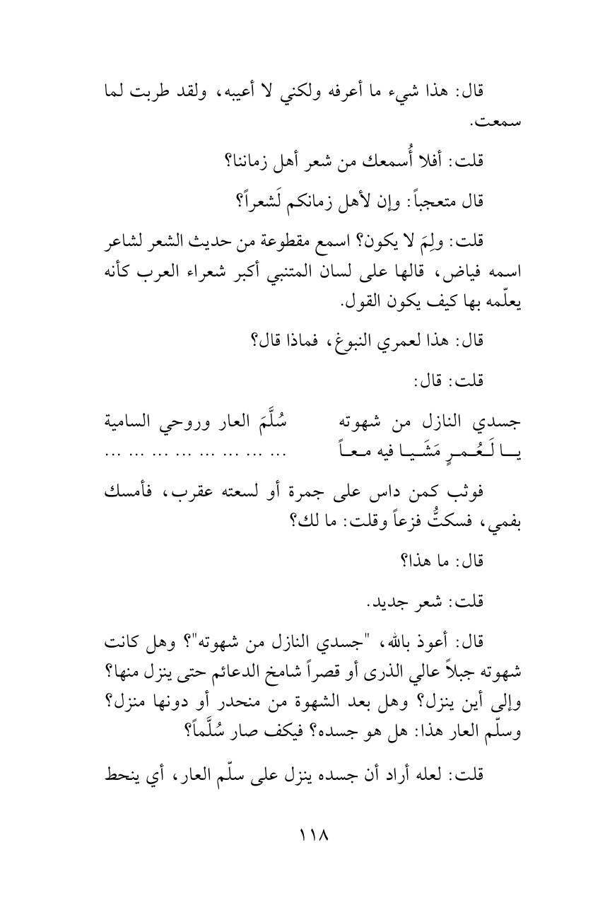 قال: أعوذ بالله، "جسدي النازل من شهوته"؟ وهل كانت شهوته جبلاً عالي الذرى أو قصراً شامخ الدعائم حتى ينزل منها؟ وإلى أين ينزل؟ وهل بعد الشهوة من منحدر أو دونها منزل؟ وسلّم العار هذا: هل هو جسده؟ فيكف صار سُلَّماً؟