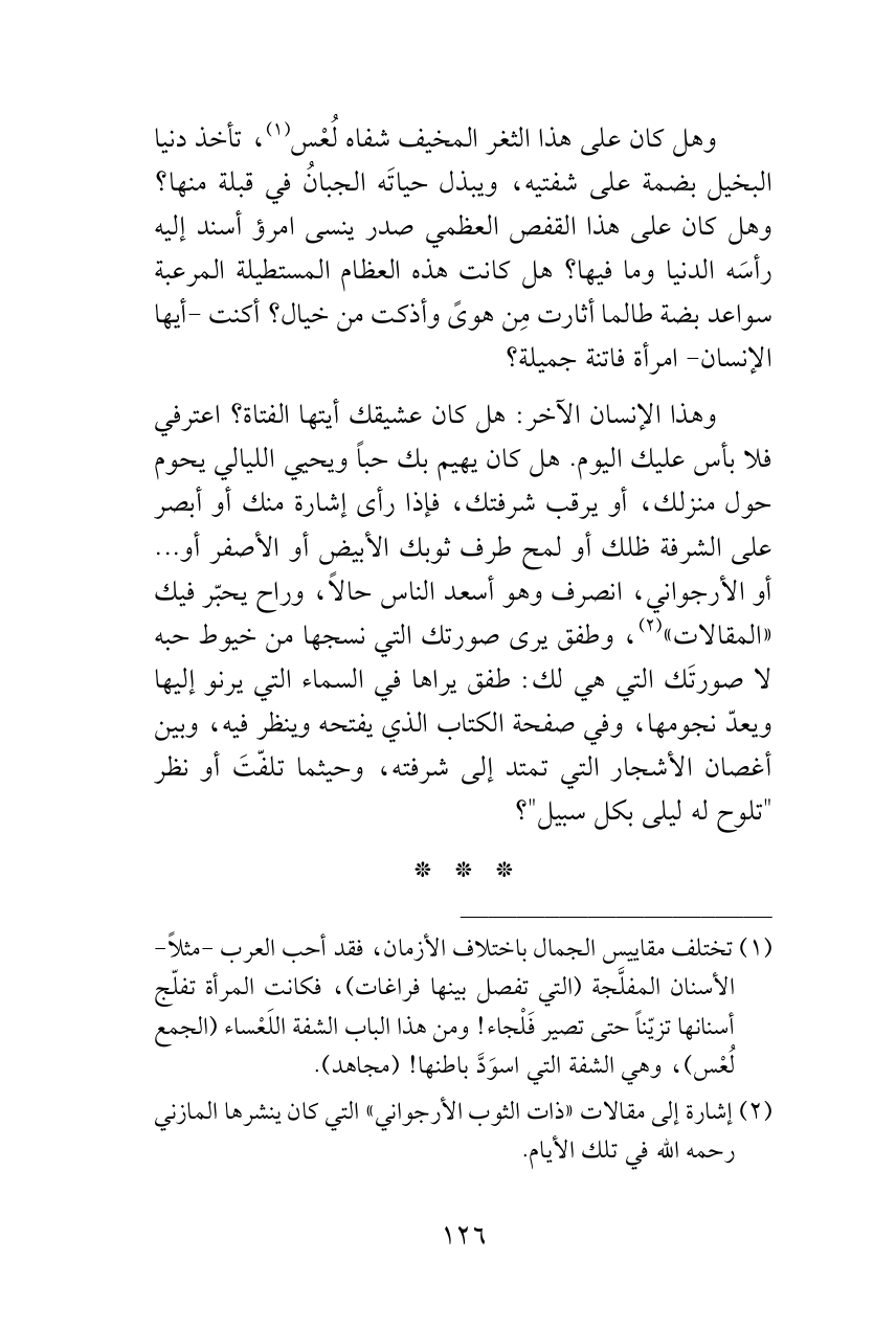 وهذا الإنسان الآخر: هل كان عشيقك أيتها الفتاة؟ اعترفي فلا بأس عليك اليوم. هل كان يهيم بك حباً ويحيي الليالي يحوم حول منزلك، أو يرقب شرفتك، فإذا رأى إشارة منك أو أبصر على الشرفة ظلك أو لمح طرف ثوبك الأبيض أو الأصفر أو ... أو الأرجواني، انصرف وهو أسعد الناس حالاً، وراح يحبّر فيك «المقالات» (¬2)، وطفق يرى صورتك التي نسجها من خيوط حبه لا صورتَك التي هي لك: طفق يراها في السماء التي يرنو إليها ويعدّ نجومها، وفي صفحة الكتاب الذي يفتحه وينظر فيه، وبين أغصان الأشجار التي تمتد إلى شرفته، وحيثما تلفّتَ أو نظر "تلوح له ليلى بكل سبيل"؟