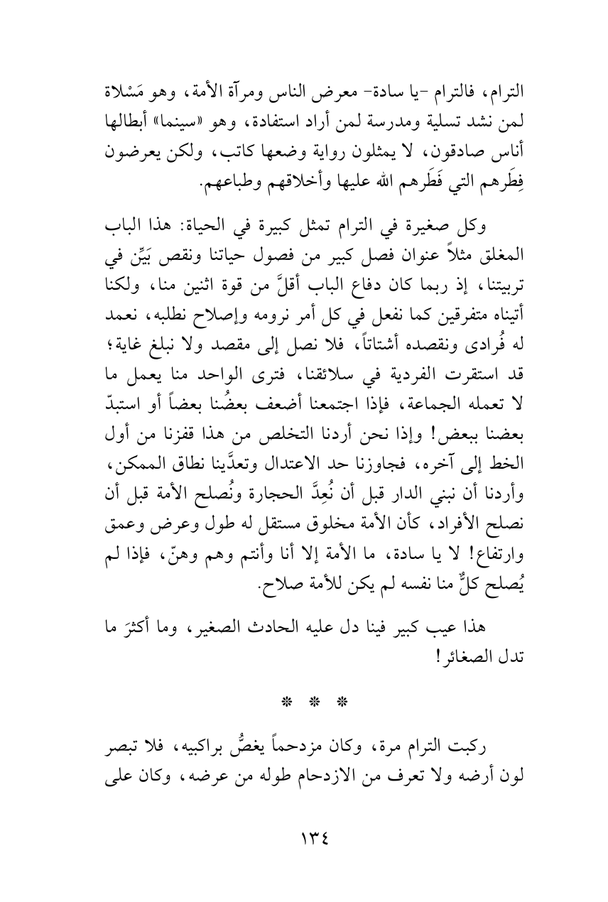 الترام، فالترام -يا سادة- معرض الناس ومرآة الأمة، وهو مَسْلاة لمن نشد تسلية ومدرسة لمن أراد استفادة، وهو «سينما» أبطالها أناس صادقون، لا يمثلون رواية وضعها كاتب، ولكن يعرضون فِطَرهم التي فَطَرهم الله عليها وأخلاقهم وطباعهم.