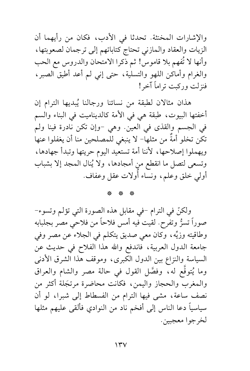 ولكنّ في الترام -في مقابل هذه الصورة التي تؤلم وتسوء- صوراً تسرُّ وتفرح. لقيت فيه أمس فلاحاً من فلاحي مصر بجلبابه وطاقيته وزيِّه، وكان معي صديق يتكلم في الجلاء عن مصر وفي جامعة الدول العربية، فاندفع والله هذا الفلاح في حديث عن السياسة والنزاع بين الدول الكبرى، وموقف هذا الشرق الأدنى وما يُتوقَّع له، وفصَّل القول في حالة مصر والشام والعراق والمغرب والحجاز واليمن، فكانت محاضرة مرتجَلة أكثر من نصف ساعة، مشى فيها الترام من الفسطاط إلى شبرا، لو أن سياسياً دعا الناس إلى أفخم ناد من النوادي فألقى عليهم مثلها لخرجوا معجبين.