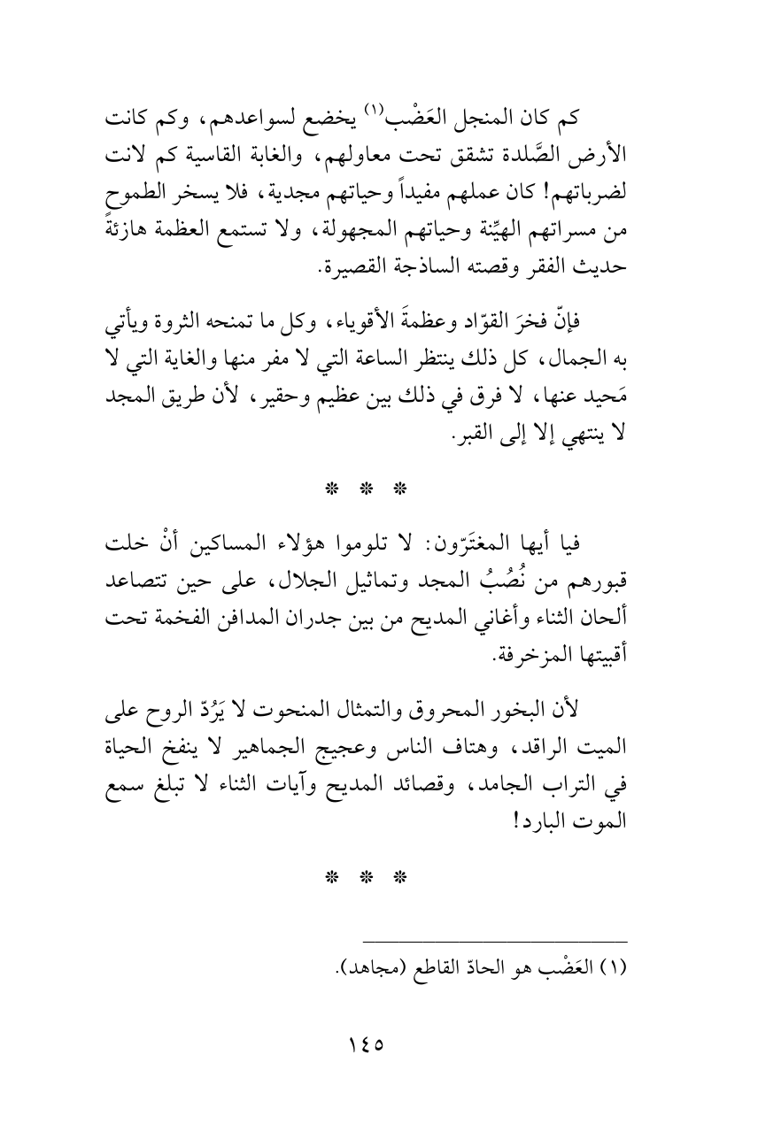 فيا أيها المغتَرّون: لا تلوموا هؤلاء المساكين أنْ خلت قبورهم من نُصُبُ المجد وتماثيل الجلال، على حين تتصاعد ألحان الثناء وأغاني المديح من بين جدران المدافن الفخمة تحت أقبيتها المزخرفة.