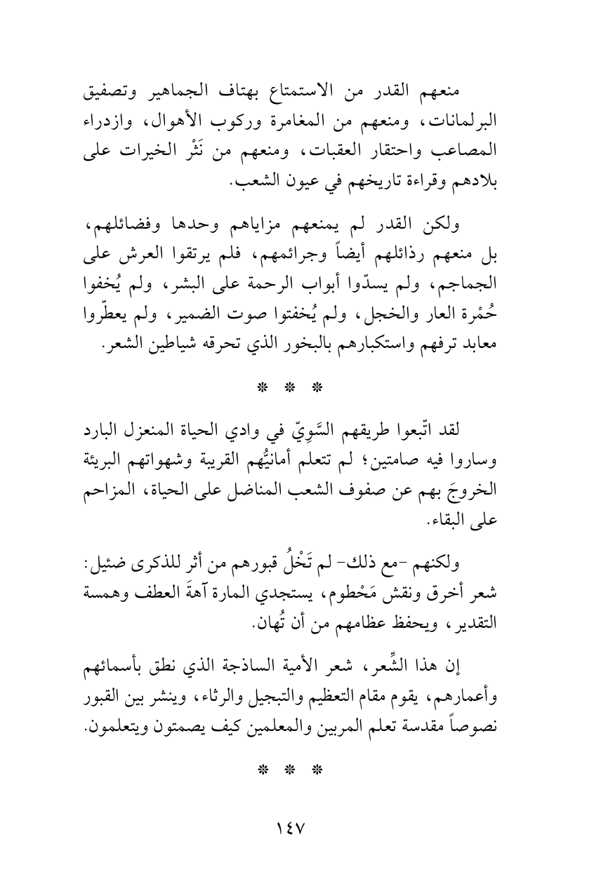 ولكن القدر لم يمنعهم مزاياهم وحدها وفضائلهم، بل منعهم رذائلهم أيضاً وجرائمهم، فلم يرتقوا العرش على الجماجم، ولم يسدّوا أبواب الرحمة على البشر، ولم يُخفوا حُمْرة العار والخجل، ولم يُخفتوا صوت الضمير، ولم يعطّروا معابد ترفهم واستكبارهم بالبخور الذي تحرقه شياطين الشعر.