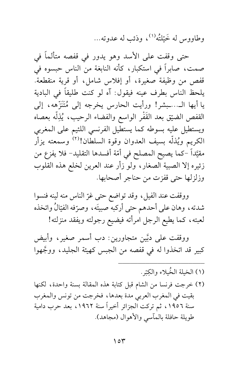 (¬2) خرجت فرنسا من الشام قبل كتابة هذه المقالة بسنة واحدة، لكنها بقيت في المغرب العربي مدة بعدها، فخرجت من تونس والمغرب سنة 1956، ثم تركت الجزائر أخيراً سنة 1962، بعد حرب دامية طويلة حافلة بالمآسي والأهوال (مجاهد).