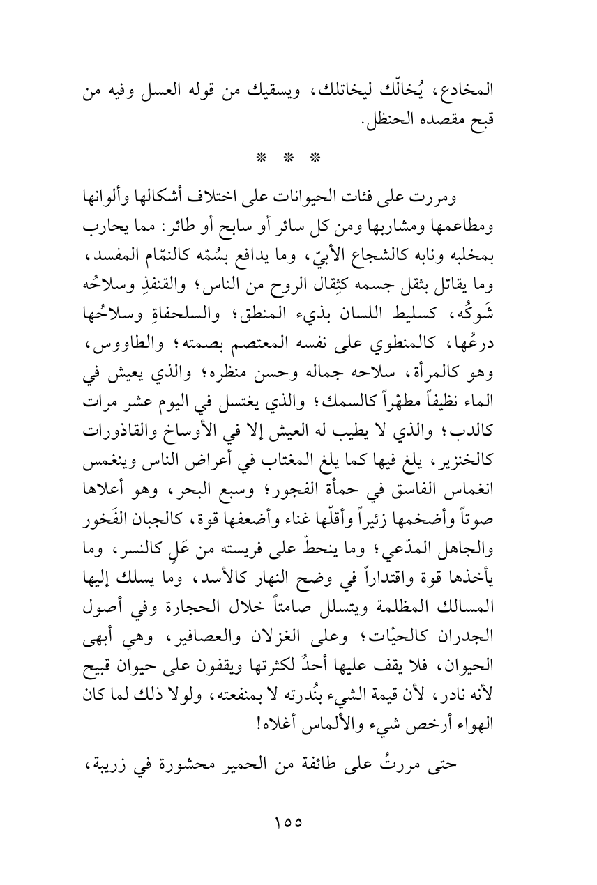 ومررت على فئات الحيوانات على اختلاف أشكالها وألوانها ومطاعمها ومشاربها ومن كل سائر أو سابح أو طائر: مما يحارب بمخلبه ونابه كالشجاع الأبيّ، وما يدافع بسُمّه كالنمّام المفسد، وما يقاتل بثقل جسمه كثِقال الروح من الناس؛ والقنفذِ وسلاحُه شَوكُه، كسليط اللسان بذيء المنطق؛ والسلحفاةِ وسلاحُها درعُها، كالمنطوي على نفسه المعتصم بصمته؛ والطاووس، وهو كالمرأة، سلاحه جماله وحسن منظره؛ والذي يعيش في الماء نظيفاً مطهّراً كالسمك؛ والذي يغتسل في اليوم عشر مرات كالدب؛ والذي لا يطيب له العيش إلا في الأوساخ والقاذورات كالخنزير، يلغ فيها كما يلغ المغتاب في أعراض الناس وينغمس انغماس الفاسق في حمأة الفجور؛ وسبع البحر، وهو أعلاها صوتاً وأضخمها زئيراً وأقلّها غناء وأضعفها قوة، كالجبان الفَخور والجاهل المدّعي؛ وما ينحطّ على فريسته من عَلٍ كالنسر، وما يأخذها قوة واقتداراً في وضح النهار كالأسد، وما يسلك إليها المسالك المظلمة ويتسلل صامتاً خلال الحجارة وفي أصول الجدران كالحيّات؛ وعلى الغزلان والعصافير، وهي أبهى الحيوان، فلا يقف عليها أحدٌ لكثرتها ويقفون على حيوان قبيح لأنه نادر، لأن قيمة الشيء بنُدرته لا بمنفعته، ولولا ذلك لما كان الهواء أرخص شيء والألماس أغلاه!