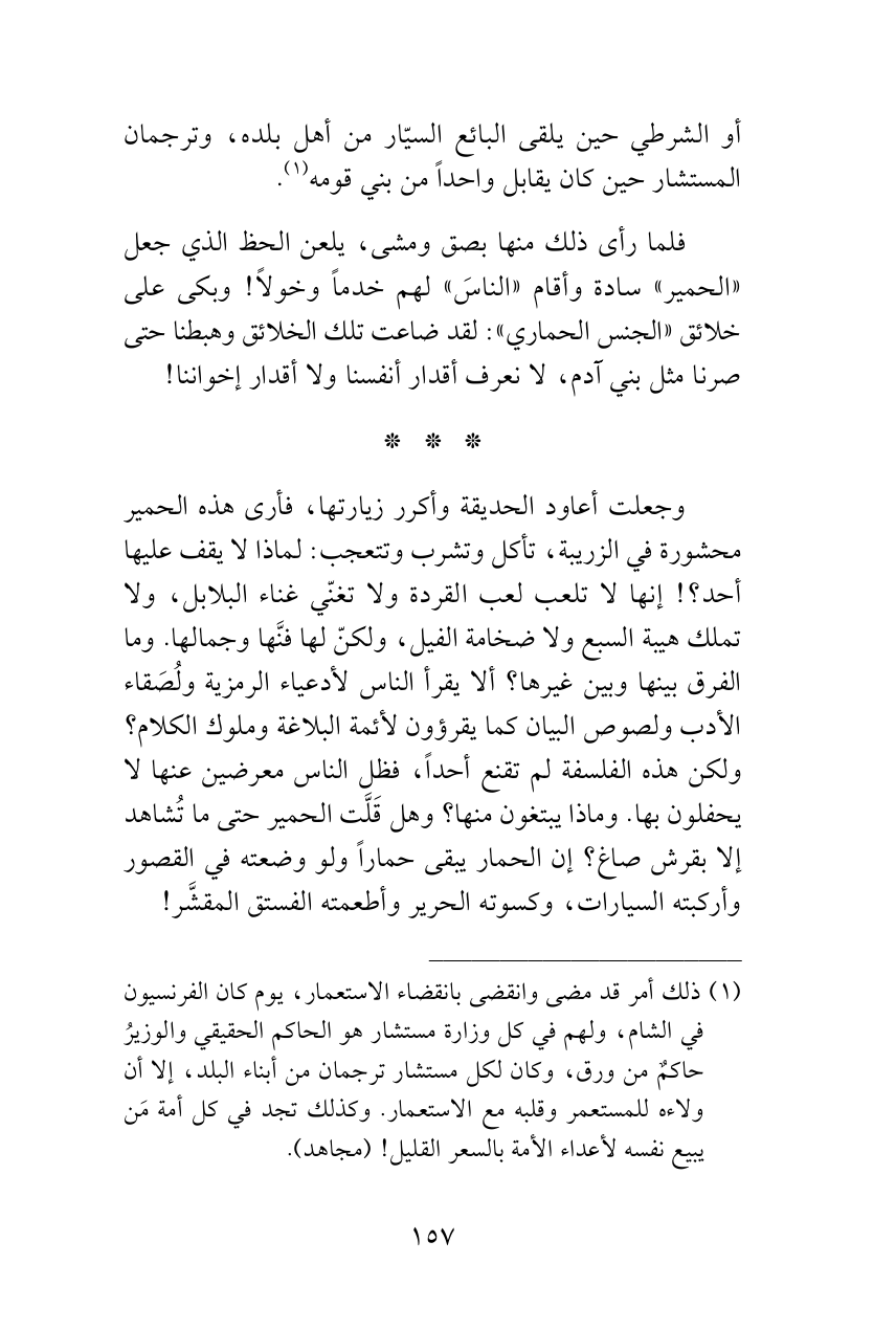 وجعلت أعاود الحديقة وأكرر زيارتها، فأرى هذه الحمير محشورة في الزريبة، تأكل وتشرب وتتعجب: لماذا لا يقف عليها أحد؟! إنها لا تلعب لعب القردة ولا تغنّي غناء البلابل، ولا تملك هيبة السبع ولا ضخامة الفيل، ولكنّ لها فنَّها وجمالها. وما الفرق بينها وبين غيرها؟ ألا يقرأ الناس لأدعياء الرمزية ولُصَقاء الأدب ولصوص البيان كما يقرؤون لأئمة البلاغة وملوك الكلام؟ ولكن هذه الفلسفة لم تقنع أحداً، فظل الناس معرضين عنها لا يحفلون بها. وماذا يبتغون منها؟ وهل قَلَّت الحمير حتى ما تُشاهد إلا بقرش صاغ؟ إن الحمار يبقى حماراً ولو وضعته في القصور وأركبته السيارات، وكسوته الحرير وأطعمته الفستق المقشَّر!