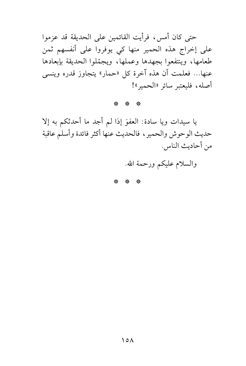 حتى كان أمس، فرأيت القائمين على الحديقة قد عزموا على إخراج هذه الحمير منها كي يوفروا على أنفسهم ثمن طعامها، وينتفعوا بجهدها وعملها، ويجمّلوا الحديقة بإبعادها عنها ... فعلمت أن هذه آخرة كل «حمار» يتجاوز قدره وينسى أصله، فليعتبر سائر «الحمير»!