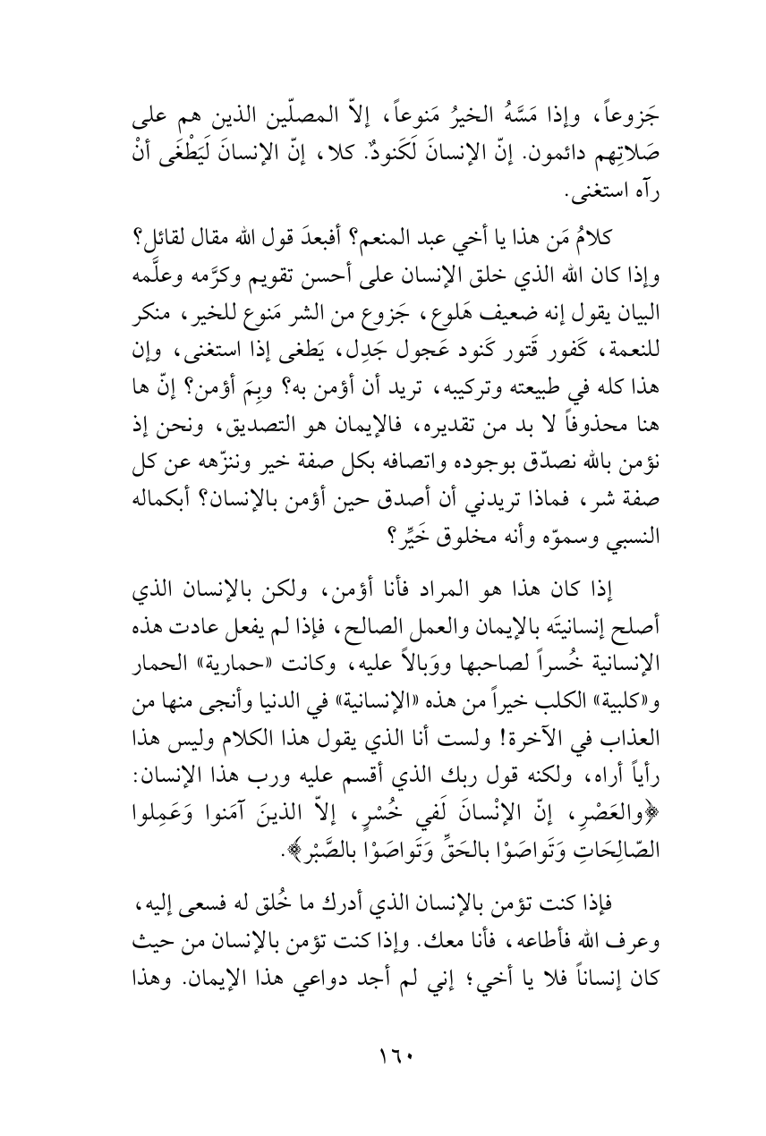 كلامُ مَن هذا يا أخي عبد المنعم؟ أفبعدَ قول الله مقال لقائل؟ وإذا كان الله الذي خلق الإنسان على أحسن تقويم وكرَّمه وعلَّمه البيان يقول إنه ضعيف هَلوع، جَزوع من الشر مَنوع للخير، منكر للنعمة، كَفور قَتور كَنود عَجول جَدِل، يَطغى إذا استغنى، وإن هذا كله في طبيعته وتركيبه، تريد أن أؤمن به؟ وبِمَ أؤمن؟ إنّ ها هنا محذوفاً لا بد من تقديره، فالإيمان هو التصديق، ونحن إذ نؤمن بالله نصدّق بوجوده واتصافه بكل صفة خير وننزّهه عن كل صفة شر، فماذا تريدني أن أصدق حين أؤمن بالإنسان؟ أبكماله النسبي وسموّه وأنه مخلوق خَيِّر؟