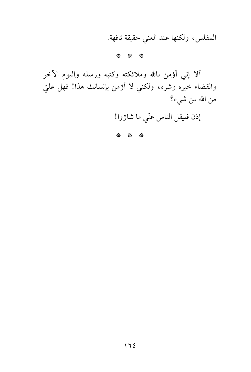 ألا إني أؤمن بالله وملائكته وكتبه ورسله واليوم الآخر والقضاء خيره وشره، ولكني لا أؤمن بإنسانك هذا! فهل عليّ من الله من شيء؟