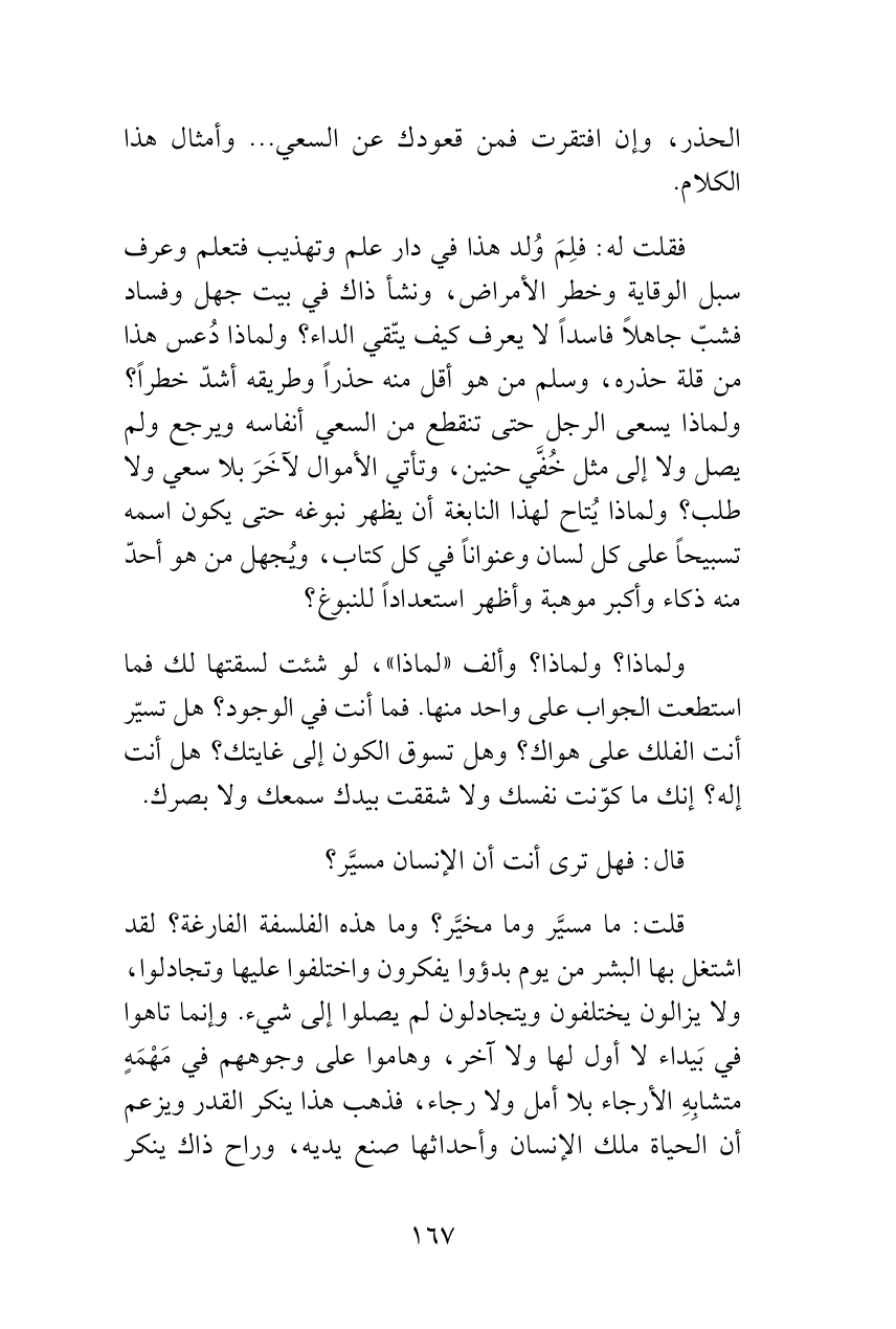 فقلت له: فلِمَ وُلد هذا في دار علم وتهذيب فتعلم وعرف سبل الوقاية وخطر الأمراض، ونشأ ذاك في بيت جهل وفساد فشبّ جاهلاً فاسداً لا يعرف كيف يتّقي الداء؟ ولماذا دُعس هذا من قلة حذره، وسلم من هو أقل منه حذراً وطريقه أشدّ خطراً؟ ولماذا يسعى الرجل حتى تنقطع من السعي أنفاسه ويرجع ولم يصل ولا إلى مثل خُفَّي حنين، وتأتي الأموال لآخَرَ بلا سعي ولا طلب؟ ولماذا يُتاح لهذا النابغة أن يظهر نبوغه حتى يكون اسمه تسبيحاً على كل لسان وعنواناً في كل كتاب، ويُجهل من هو أحدّ منه ذكاء وأكبر موهبة وأظهر استعداداً للنبوغ؟