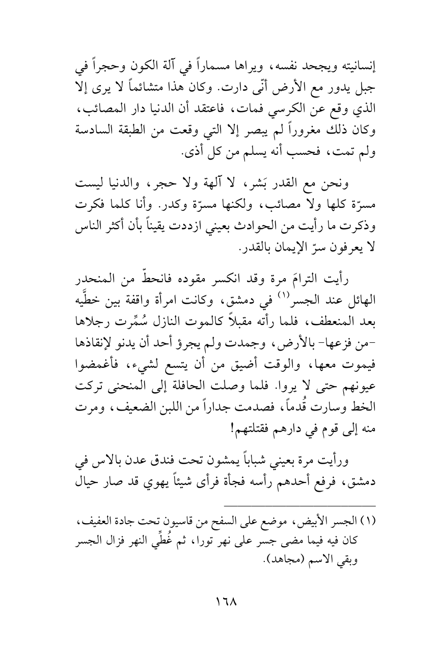 ونحن مع القدر بَشر، لا آلهة ولا حجر، والدنيا ليست مسرّة كلها ولا مصائب، ولكنها مسرّة وكدر. وأنا كلما فكرت وذكرت ما رأيت من الحوادث بعيني ازددت يقيناً بأن أكثر الناس لا يعرفون سرّ الإيمان بالقدر.