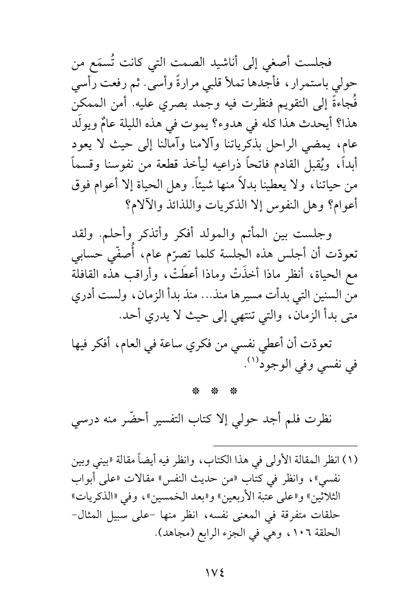 وجلست بين المأتم والمولد أفكر وأتذكر وأحلم. ولقد تعودّت أن أجلس هذه الجلسة كلما تصرّم عام، أُصفّي حسابي مع الحياة، أنظر ماذا أخذَتْ وماذا أعطَتْ، وأراقب هذه القافلة من السنين التي بدأت مسيرها منذ ... منذ بدأ الزمان، ولست أدري متى بدأ الزمان، والتي تنتهي إلى حيث لا يدري أحد.