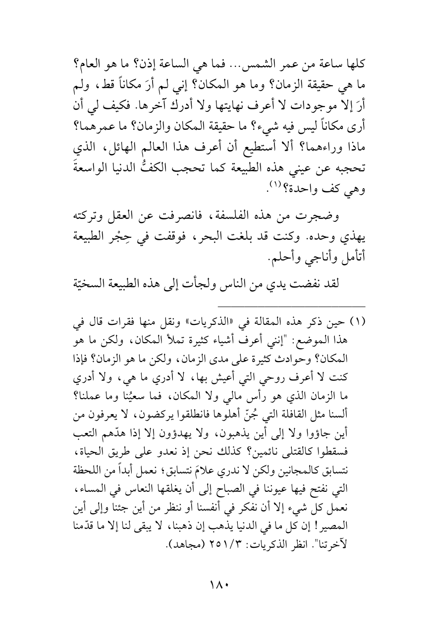 (¬1) حين ذكر هذه المقالة في «الذكريات» ونقل منها فقرات قال في هذا الموضع: "إنني أعرف أشياء كثيرة تملأ المكان، ولكن ما هو المكان؟ وحوادث كثيرة على مدى الزمان، ولكن ما هو الزمان؟ فإذا كنت لا أعرف روحي التي أعيش بها، لا أدري ما هي، ولا أدري ما الزمان الذي هو رأس مالي ولا المكان، فما سعيُنا وما عملنا؟ ألسنا مثل القافلة التي جُنّ أهلوها فانطلقوا يركضون، لا يعرفون من أين جاؤوا ولا إلى أين يذهبون، ولا يهدؤون إلا إذا هدّهم التعب فسقطوا كالقتلى نائمين؟ كذلك نحن إذ نعدو على طريق الحياة، نتسابق كالمجانين ولكن لا ندري علامَ نتسابق؛ نعمل أبداً من اللحظة التي نفتح فيها عيوننا في الصباح إلى أن يغلقها النعاس في المساء، نعمل كل شيء إلا أن نفكر في أنفسنا أو ننظر من أين جئنا وإلى أين المصير! إن كل ما في الدنيا يذهب إن ذهبنا، لا يبقى لنا إلا ما قدّمنا لآخرتنا". انظر الذكريات: 3/ 251 (مجاهد).