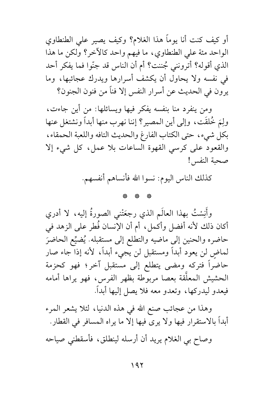 ومن ينفرد منا بنفسه يفكر فيها ويسائلها: من أين جاءت، ولِمَ خُلقَت، وإلى أين المصير؟ إننا نهرب منها أبداً ونشتغل عنها بكل شيء، حتى الكتاب الفارغ والحديث التافه واللعبة الحمقاء، والقعود على كرسي القهوة الساعات بلا عمل، كل شيء إلا صحبة النفس!