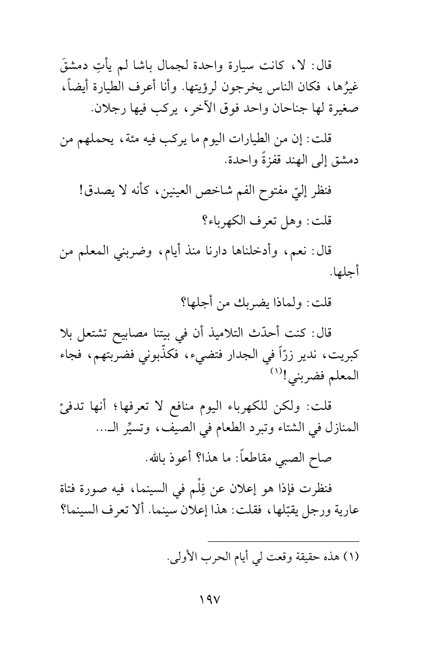 قال: لا، كانت سيارة واحدة لجمال باشا لم يأتِ دمشقَ غيرُها، فكان الناس يخرجون لرؤيتها. وأنا أعرف الطيارة أيضاً، صغيرة لها جناحان واحد فوق الآخر، يركب فيها رجلان.