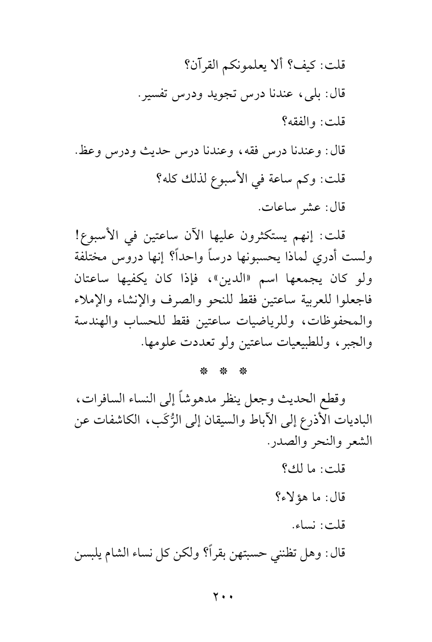 وقطع الحديث وجعل ينظر مدهوشاً إلى النساء السافرات، الباديات الأذرع إلى الآباط والسيقان إلى الرُّكَب، الكاشفات عن الشعر والنحر والصدر.