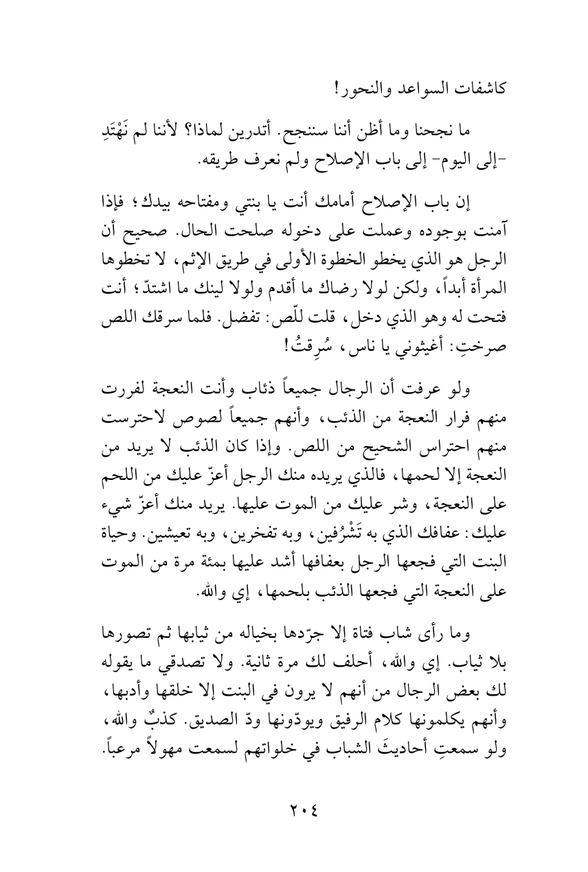 وما رأى شاب فتاة إلا جرّدها بخياله من ثيابها ثم تصورها بلا ثياب. إي والله، أحلف لك مرة ثانية. ولا تصدقي ما يقوله لك بعض الرجال من أنهم لا يرون في البنت إلا خلقها وأدبها، وأنهم يكلمونها كلام الرفيق ويودّونها ودّ الصديق. كذبٌ والله، ولو سمعتِ أحاديثَ الشباب في خلواتهم لسمعت مهولاً مرعباً.