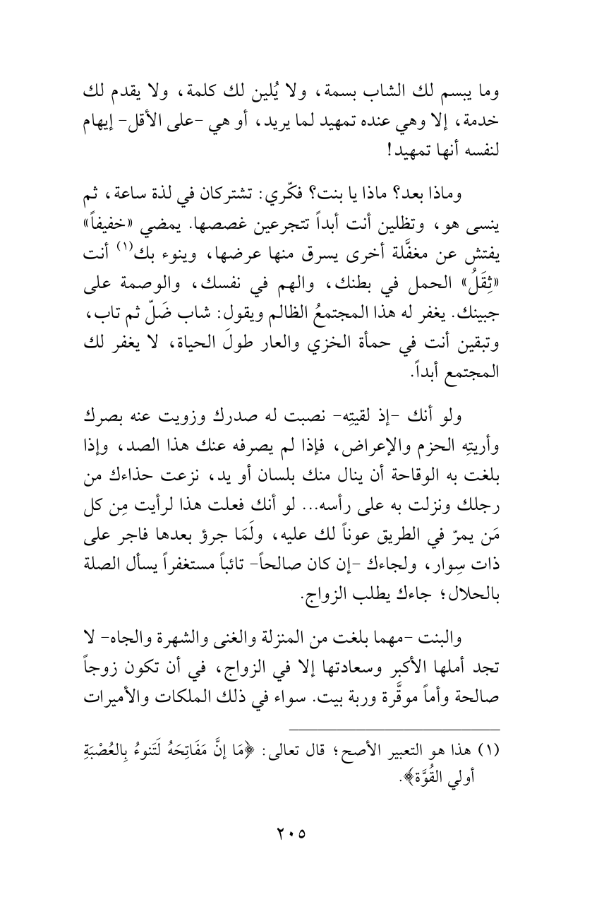 ولو أنك -إذ لقيتِه- نصبت له صدرك وزويت عنه بصرك وأريتِه الحزم والإعراض، فإذا لم يصرفه عنك هذا الصد، وإذا بلغت به الوقاحة أن ينال منك بلسان أو يد، نزعت حذاءك من رجلك ونزلت به على رأسه ... لو أنك فعلت هذا لرأيت مِن كل مَن يمرّ في الطريق عوناً لك عليه، ولَمَا جرؤ بعدها فاجر على ذات سِوار، ولجاءك -إن كان صالحاً- تائباً مستغفراً يسأل الصلة بالحلال؛ جاءك يطلب الزواج.