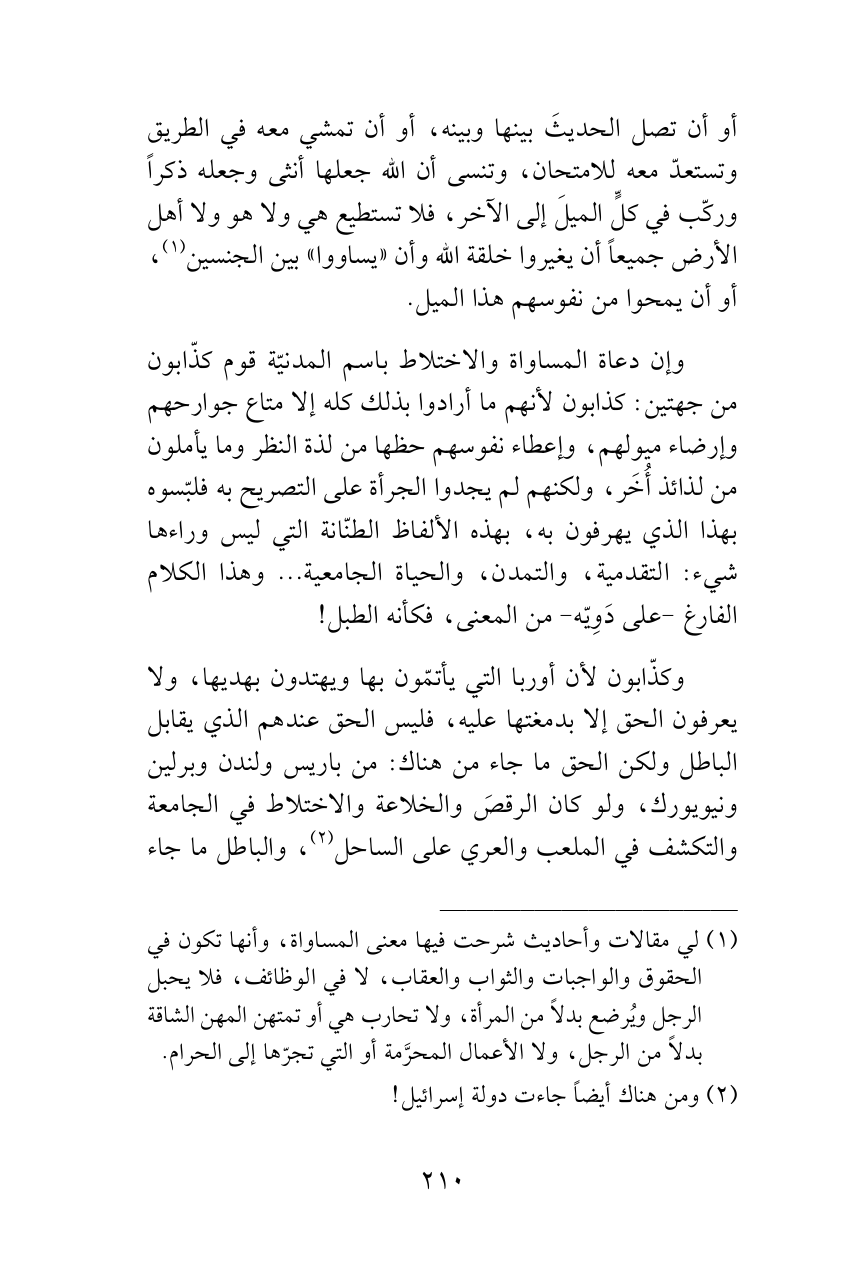 أو أن تصل الحديثَ بينها وبينه، أو أن تمشي معه في الطريق وتستعدّ معه للامتحان، وتنسى أن الله جعلها أنثى وجعله ذكراً وركّب في كلٍّ الميلَ إلى الآخر، فلا تستطيع هي ولا هو ولا أهل الأرض جميعاً أن يغيروا خلقة الله وأن «يساووا» بين الجنسين (¬1)، أو أن يمحوا من نفوسهم هذا الميل.
