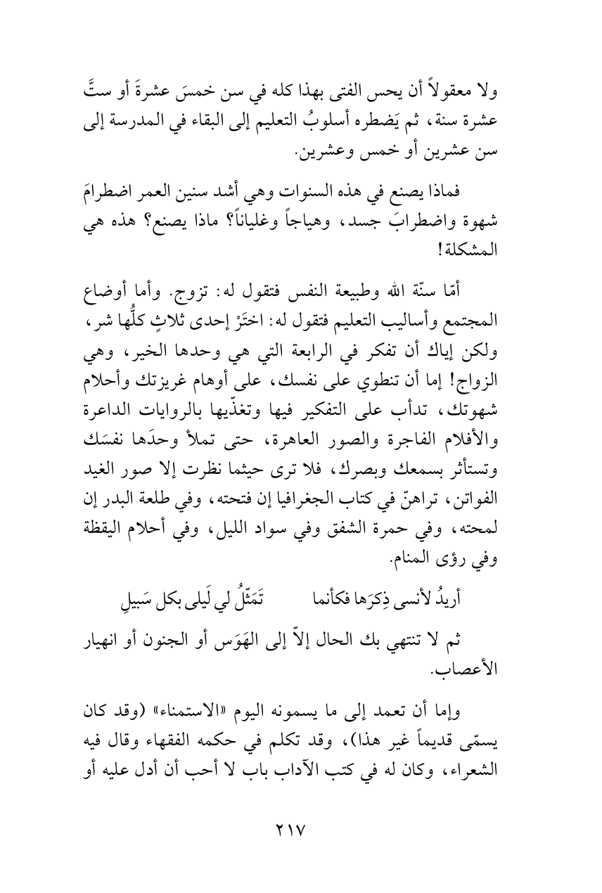 أمّا سنّة الله وطبيعة النفس فتقول له: تزوج. وأما أوضاع المجتمع وأساليب التعليم فتقول له: اختَرْ إحدى ثلاثٍ كلُّها شر، ولكن إياك أن تفكر في الرابعة التي هي وحدها الخير، وهي الزواج! إما أن تنطوي على نفسك، على أوهام غريزتك وأحلام شهوتك، تدأب على التفكير فيها وتغذّيها بالروايات الداعرة والأفلام الفاجرة والصور العاهرة، حتى تملأ وحدَها نفسَك وتستأثر بسمعك وبصرك، فلا ترى حيثما نظرت إلا صور الغيد الفواتن، تراهنّ في كتاب الجغرافيا إن فتحته، وفي طلعة البدر إن لمحته، وفي حمرة الشفق وفي سواد الليل، وفي أحلام اليقظة وفي رؤى المنام.