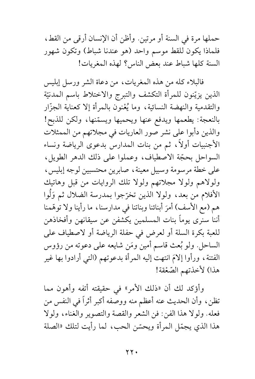 وأؤكد لك أن «ذلك الأمر» في حقيقته أتفه وأهون مما تظن، وأن الحديث عنه أعظم منه ووصفه أكبر أثراً في النفس من فعله. ولولا هذا الفن: فن الشعر والقصة والتصوير والغناء، ولولا هذا الذي يجمّل المرأة ويحسّن الحب، لما رأيت لتلك «الصلة