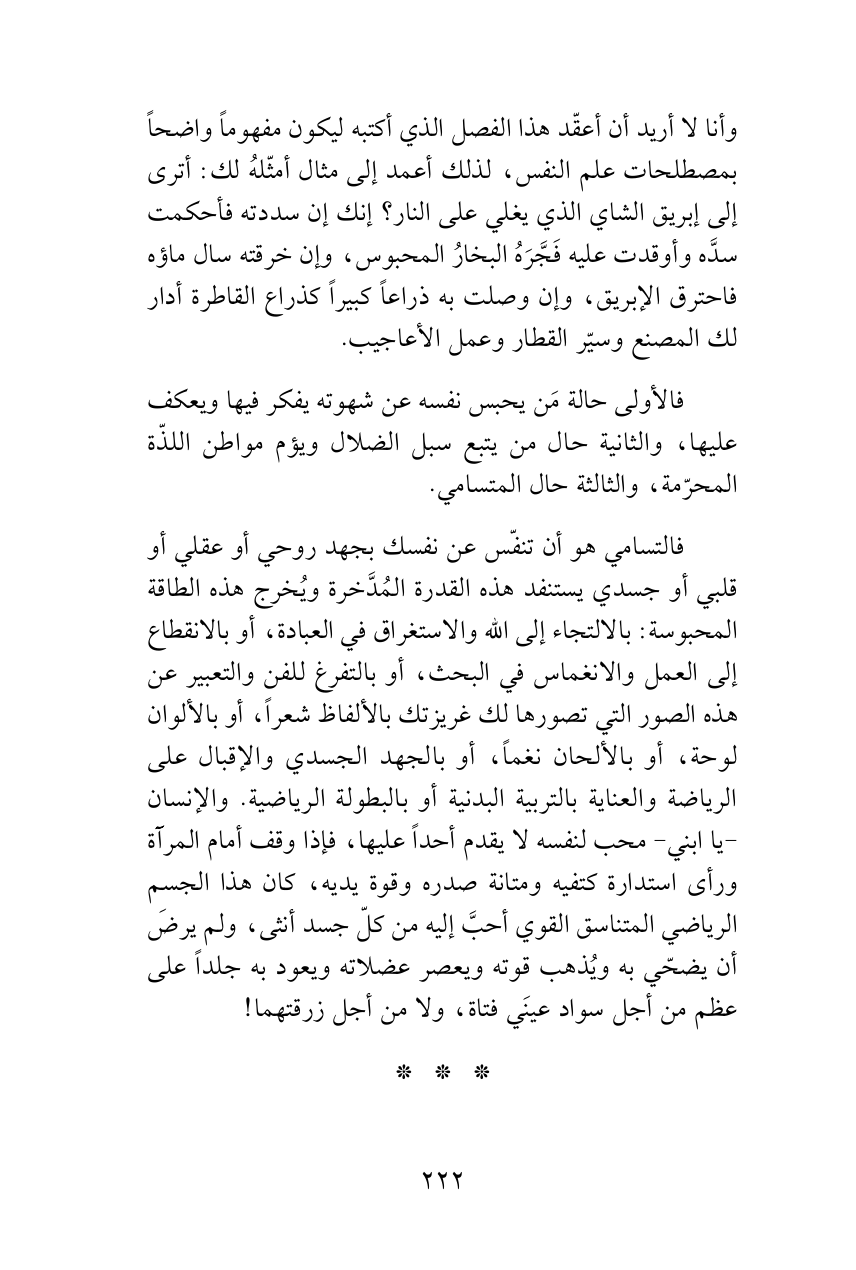 فالتسامي هو أن تنفّس عن نفسك بجهد روحي أو عقلي أو قلبي أو جسدي يستنفد هذه القدرة المُدَّخرة ويُخرج هذه الطاقة المحبوسة: بالالتجاء إلى الله والاستغراق في العبادة، أو بالانقطاع إلى العمل والانغماس في البحث، أو بالتفرغ للفن والتعبير عن هذه الصور التي تصورها لك غريزتك بالألفاظ شعراً، أو بالألوان لوحة، أو بالألحان نغماً، أو بالجهد الجسدي والإقبال على الرياضة والعناية بالتربية البدنية أو بالبطولة الرياضية. والإنسان -يا ابني- محب لنفسه لا يقدم أحداً عليها، فإذا وقف أمام المرآة ورأى استدارة كتفيه ومتانة صدره وقوة يديه، كان هذا الجسم الرياضي المتناسق القوي أحبَّ إليه من كلّ جسد أنثى، ولم يرضَ أن يضحّي به ويُذهب قوته ويعصر عضلاته ويعود به جلداً على عظم من أجل سواد عينَي فتاة، ولا من أجل زرقتهما!
