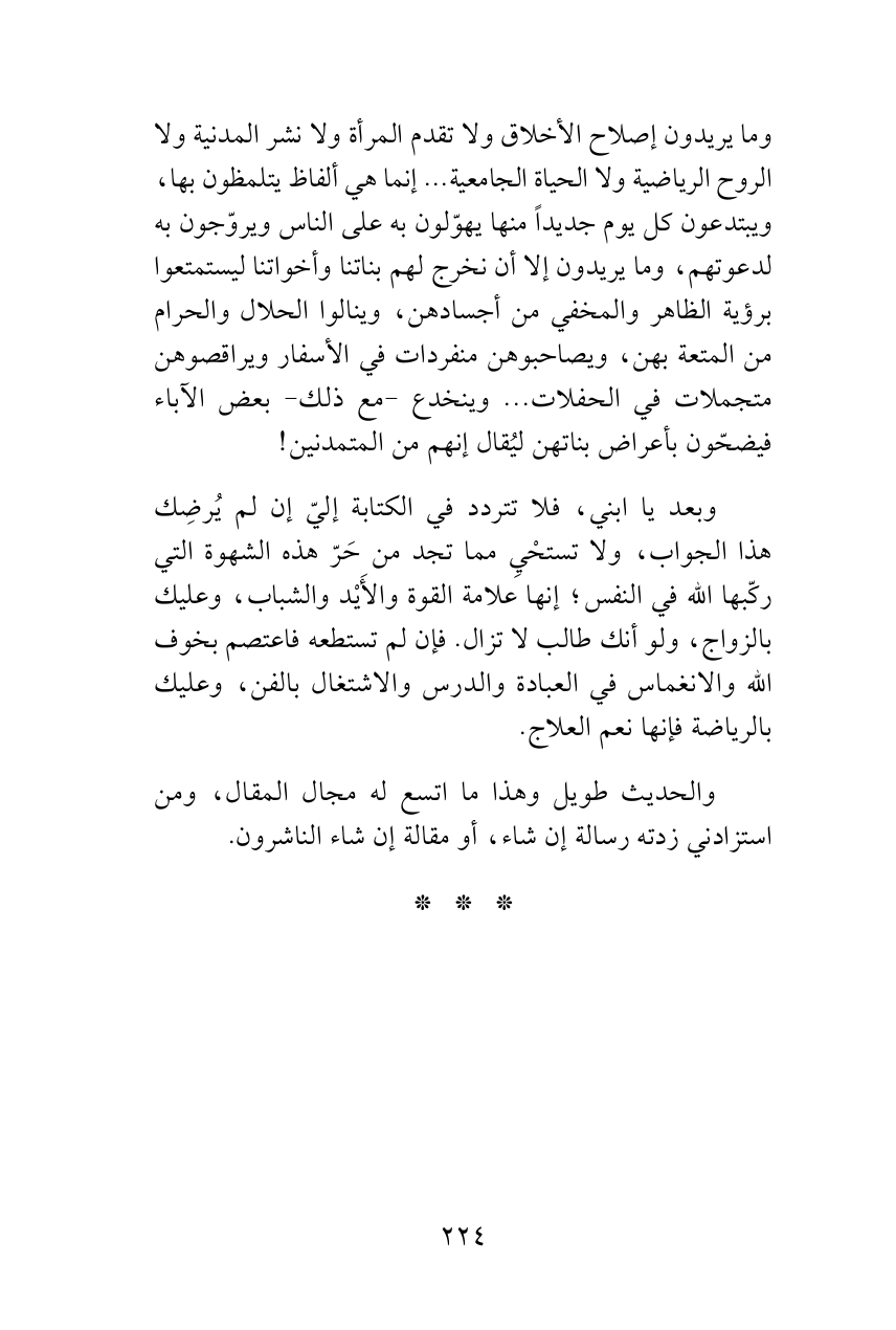 وبعد يا ابني، فلا تتردد في الكتابة إليّ إن لم يُرضِك هذا الجواب، ولا تستحْيِ مما تجد من حَرّ هذه الشهوة التي ركّبها الله في النفس؛ إنها علامة القوة والأَيْد والشباب، وعليك بالزواج، ولو أنك طالب لا تزال. فإن لم تستطعه فاعتصم بخوف الله والانغماس في العبادة والدرس والاشتغال بالفن، وعليك بالرياضة فإنها نعم العلاج.