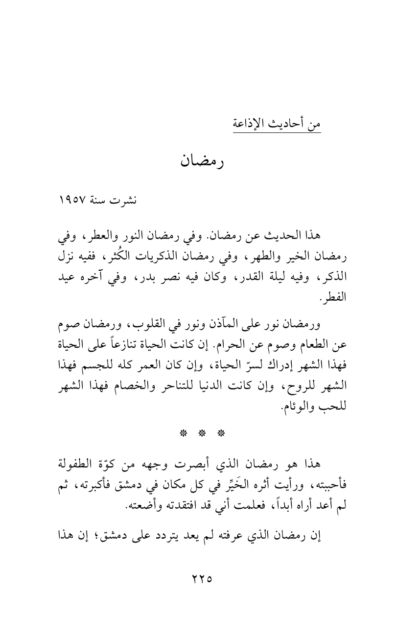 هذا هو رمضان الذي أبصرت وجهه من كوّة الطفولة فأحببته، ورأيت أثره الخَيِّر في كل مكان في دمشق فأكبرته، ثم لم أعد أراه أبداً، فعلمت أني قد افتقدته وأضعته.
