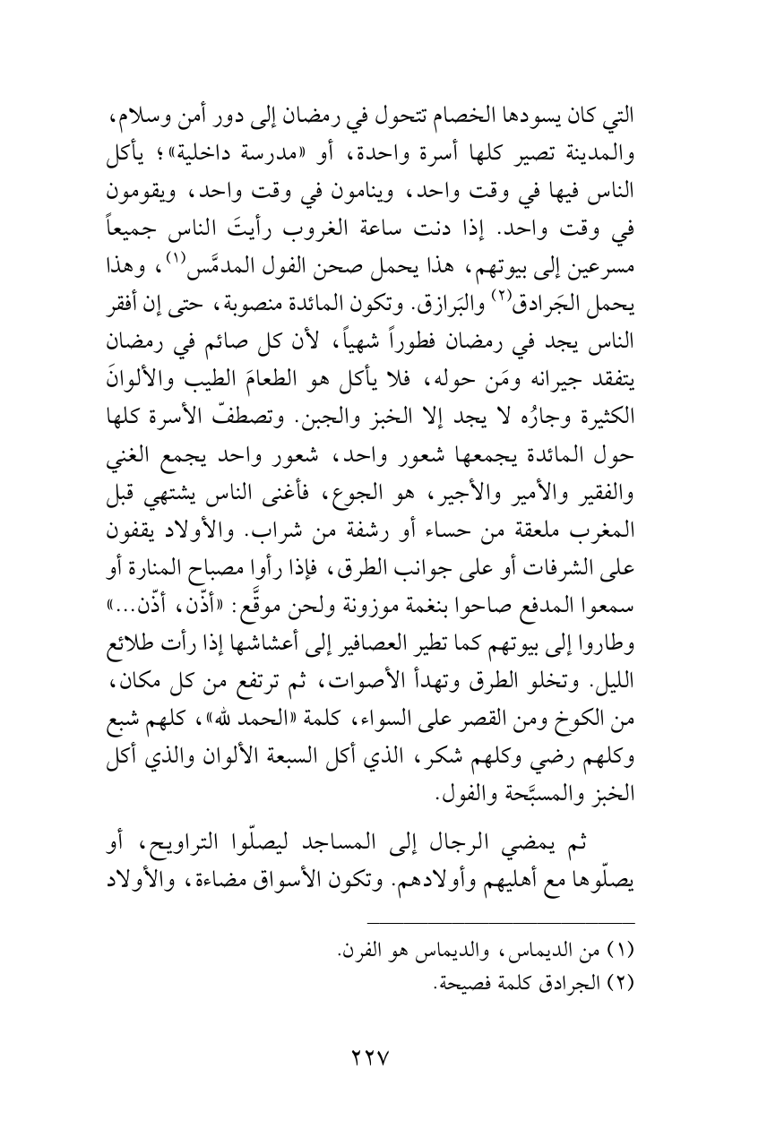 التي كان يسودها الخصام تتحول في رمضان إلى دور أمن وسلام، والمدينة تصير كلها أسرة واحدة، أو «مدرسة داخلية»؛ يأكل الناس فيها في وقت واحد، وينامون في وقت واحد، ويقومون في وقت واحد. إذا دنت ساعة الغروب رأيتَ الناس جميعاً مسرعين إلى بيوتهم، هذا يحمل صحن الفول المدمَّس (¬1)، وهذا يحمل الجَرادق (¬2) والبَرازق. وتكون المائدة منصوبة، حتى إن أفقر الناس يجد في رمضان فطوراً شهياً، لأن كل صائم في رمضان يتفقد جيرانه ومَن حوله، فلا يأكل هو الطعامَ الطيب والألوانَ الكثيرة وجارُه لا يجد إلا الخبز والجبن. وتصطفّ الأسرة كلها حول المائدة يجمعها شعور واحد، شعور واحد يجمع الغني والفقير والأمير والأجير، هو الجوع، فأغنى الناس يشتهي قبل المغرب ملعقة من حساء أو رشفة من شراب. والأولاد يقفون على الشرفات أو على جوانب الطرق، فإذا رأوا مصباح المنارة أو سمعوا المدفع صاحوا بنغمة موزونة ولحن موقَّع: «أذّن، أذّن ...» وطاروا إلى بيوتهم كما تطير العصافير إلى أعشاشها إذا رأت طلائع الليل. وتخلو الطرق وتهدأ الأصوات، ثم ترتفع من كل مكان، من الكوخ ومن القصر على السواء، كلمة «الحمد لله»، كلهم شبع وكلهم رضي وكلهم شكر، الذي أكل السبعة الألوان والذي أكل الخبز والمسبَّحة والفول.