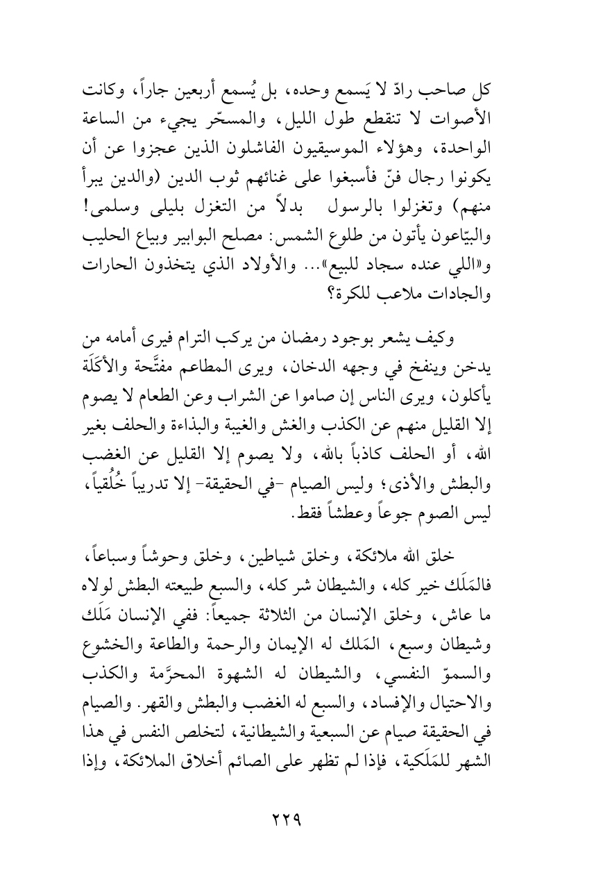 وكيف يشعر بوجود رمضان من يركب الترام فيرى أمامه من يدخن وينفخ في وجهه الدخان، ويرى المطاعم مفتَّحة والأكَلَة يأكلون، ويرى الناس إن صاموا عن الشراب وعن الطعام لا يصوم إلا القليل منهم عن الكذب والغش والغيبة والبذاءة والحلف بغير الله، أو الحلف كاذباً بالله، ولا يصوم إلا القليل عن الغضب والبطش والأذى؛ وليس الصيام -في الحقيقة- إلا تدريباً خُلُقياً، ليس الصوم جوعاً وعطشاً فقط.