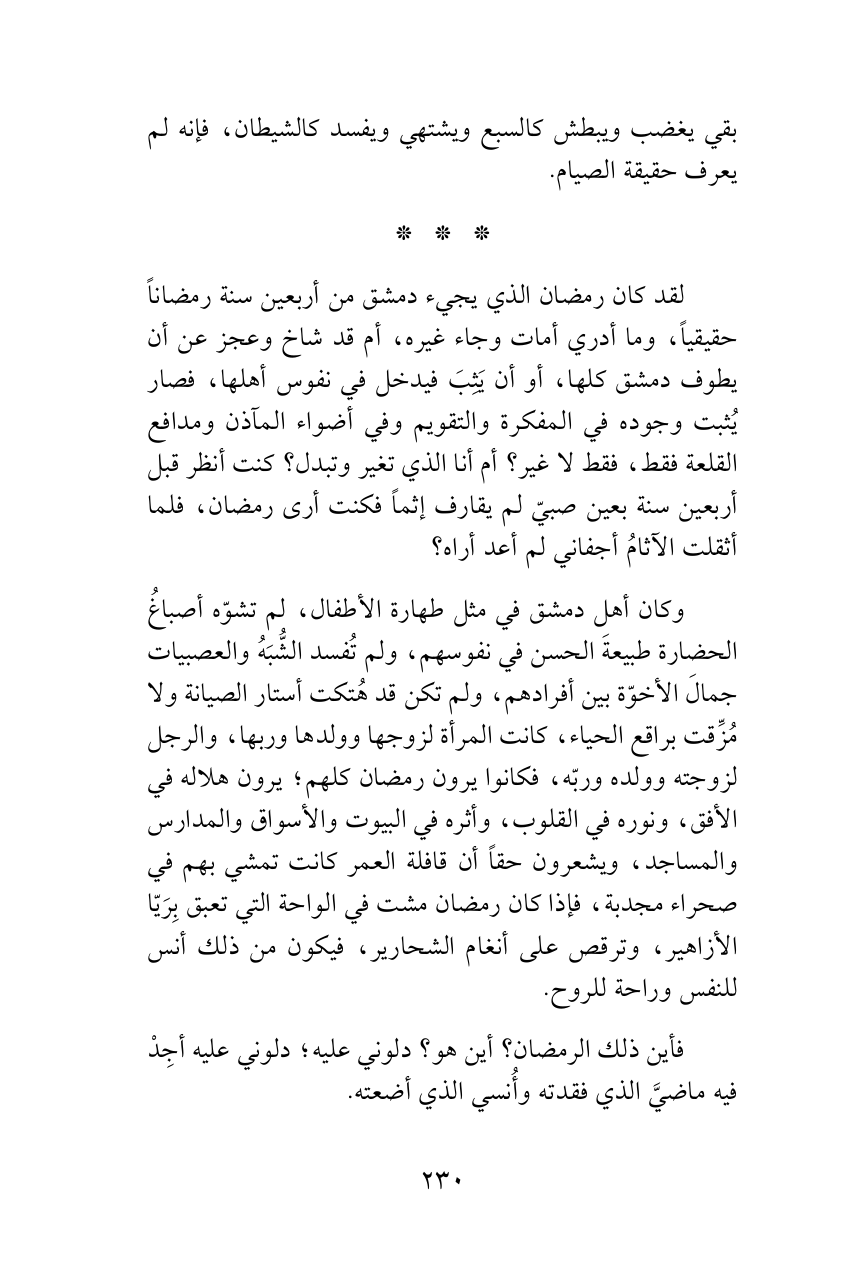 لقد كان رمضان الذي يجيء دمشق من أربعين سنة رمضاناً حقيقياً، وما أدري أمات وجاء غيره، أم قد شاخ وعجز عن أن يطوف دمشق كلها، أو أن يَثِبَ فيدخل في نفوس أهلها، فصار يُثبت وجوده في المفكرة والتقويم وفي أضواء المآذن ومدافع القلعة فقط، فقط لا غير؟ أم أنا الذي تغير وتبدل؟ كنت أنظر قبل أربعين سنة بعين صبيّ لم يقارف إثماً فكنت أرى رمضان، فلما أثقلت الآثامُ أجفاني لم أعد أراه؟