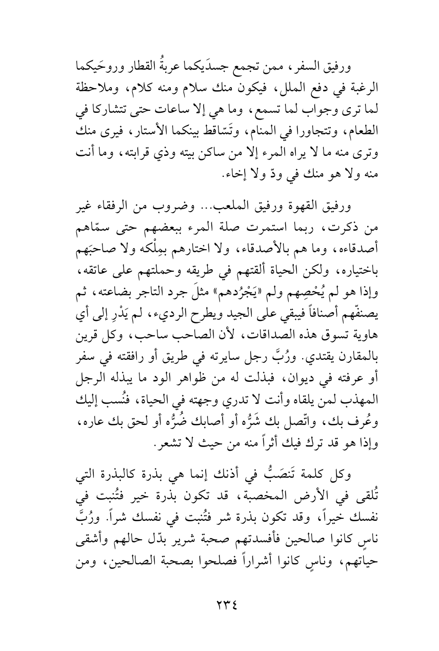 ورفيق القهوة ورفيق الملعب ... وضروب من الرفقاء غير من ذكرت، ربما استمرت صلة المرء ببعضهم حتى سمّاهم أصدقاءه، وما هم بالأصدقاء، ولا اختارهم بمِلْكه ولا صاحبَهم باختياره، ولكن الحياة ألقتهم في طريقه وحملتهم على عاتقه، وإذا هو لم يُحْصِهم ولم «يَجْرُدهم» مثلَ جرد التاجر بضاعته، ثم يصنفّهم أصنافاً فيبقي على الجيد ويطرح الرديء، لم يَدْرِ إلى أي هاوية تسوق هذه الصداقات، لأن الصاحب ساحب، وكل قرين بالمقارن يقتدي. ورُبَّ رجل سايرته في طريق أو رافقته في سفر أو عرفته في ديوان، فبذلت له من ظواهر الود ما يبذله الرجل المهذب لمن يلقاه وأنت لا تدري وجهته في الحياة، فنُسب إليك وعُرف بك، واتّصل بك شَرُّه أو أصابك ضُرُّه أو لحق بك عاره، وإذا هو قد ترك فيك أثراً منه من حيث لا تشعر.