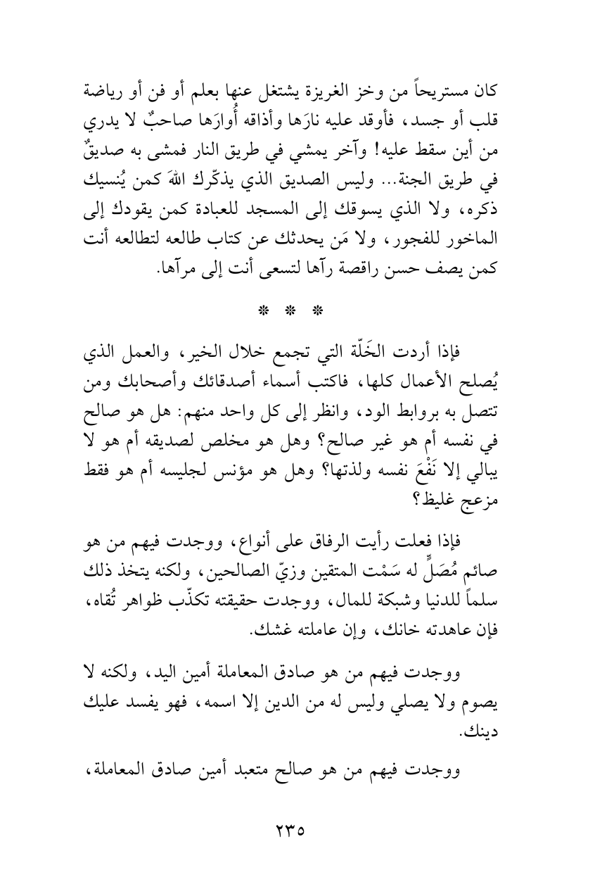 فإذا أردت الخَلّة التي تجمع خلال الخير، والعمل الذي يُصلح الأعمال كلها، فاكتب أسماء أصدقائك وأصحابك ومن تتصل به بروابط الود، وانظر إلى كل واحد منهم: هل هو صالح في نفسه أم هو غير صالح؟ وهل هو مخلص لصديقه أم هو لا يبالي إلا نَفْعَ نفسه ولذتها؟ وهل هو مؤنس لجليسه أم هو فقط مزعج غليظ؟