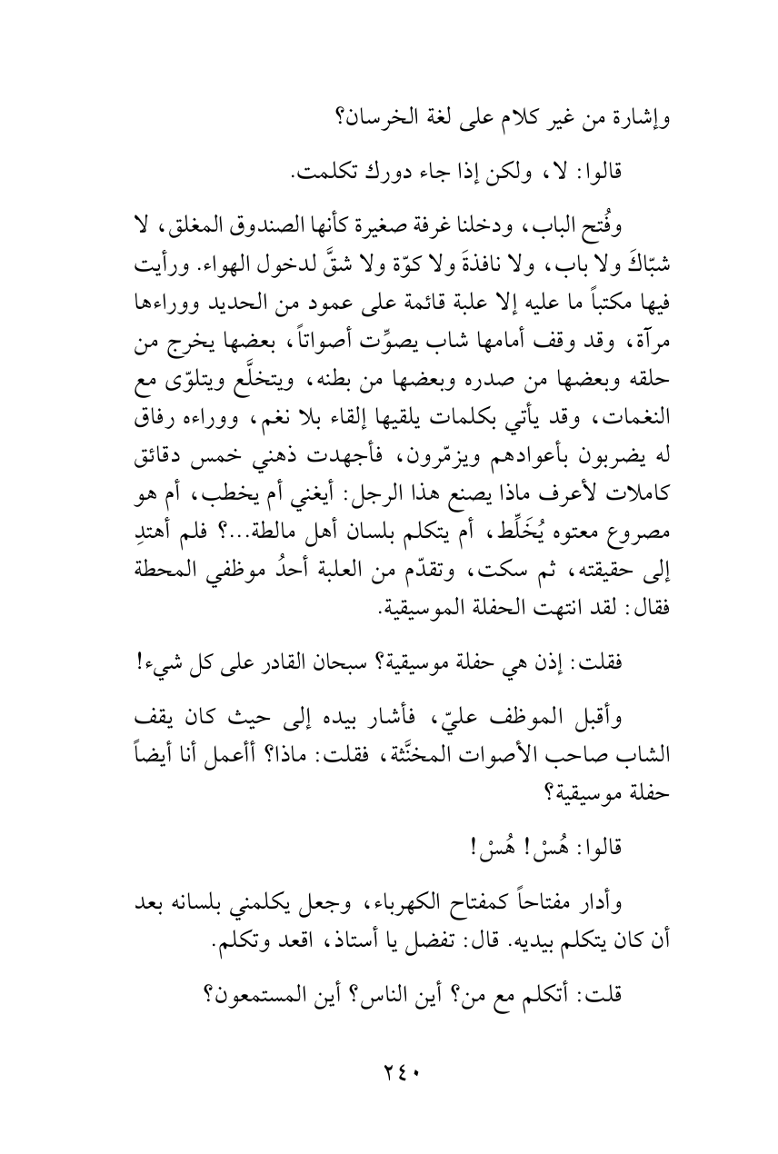 وفُتح الباب، ودخلنا غرفة صغيرة كأنها الصندوق المغلق، لا شبّاكَ ولا باب، ولا نافذةَ ولا كوّة ولا شقَّ لدخول الهواء. ورأيت فيها مكتباً ما عليه إلا علبة قائمة على عمود من الحديد ووراءها مرآة، وقد وقف أمامها شاب يصوِّت أصواتاً، بعضها يخرج من حلقه وبعضها من صدره وبعضها من بطنه، ويتخلَّع ويتلوّى مع النغمات، وقد يأتي بكلمات يلقيها إلقاء بلا نغم، ووراءه رفاق له يضربون بأعوادهم ويزمّرون، فأجهدت ذهني خمس دقائق كاملات لأعرف ماذا يصنع هذا الرجل: أيغني أم يخطب، أم هو مصروع معتوه يُخَلِّط، أم يتكلم بلسان أهل مالطة ... ؟ فلم أهتدِ إلى حقيقته، ثم سكت، وتقدّم من العلبة أحدُ موظفي المحطة فقال: لقد انتهت الحفلة الموسيقية.