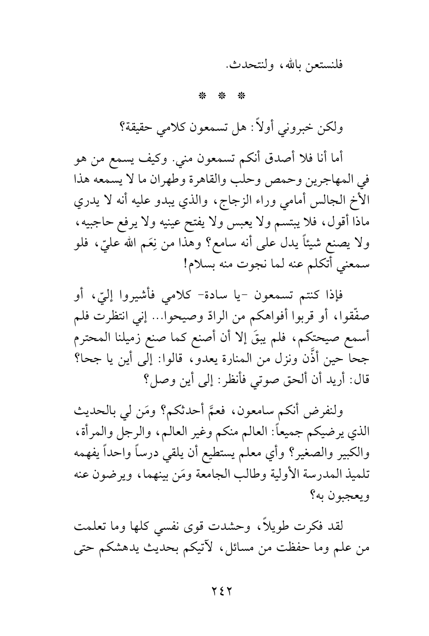 ولنفرض أنكم سامعون، فعمَّ أحدثكم؟ ومَن لي بالحديث الذي يرضيكم جميعاً: العالم منكم وغير العالم، والرجل والمرأة، والكبير والصغير؟ وأي معلم يستطيع أن يلقي درساً واحداً يفهمه تلميذ المدرسة الأولية وطالب الجامعة ومَن بينهما، ويرضون عنه ويعجبون به؟