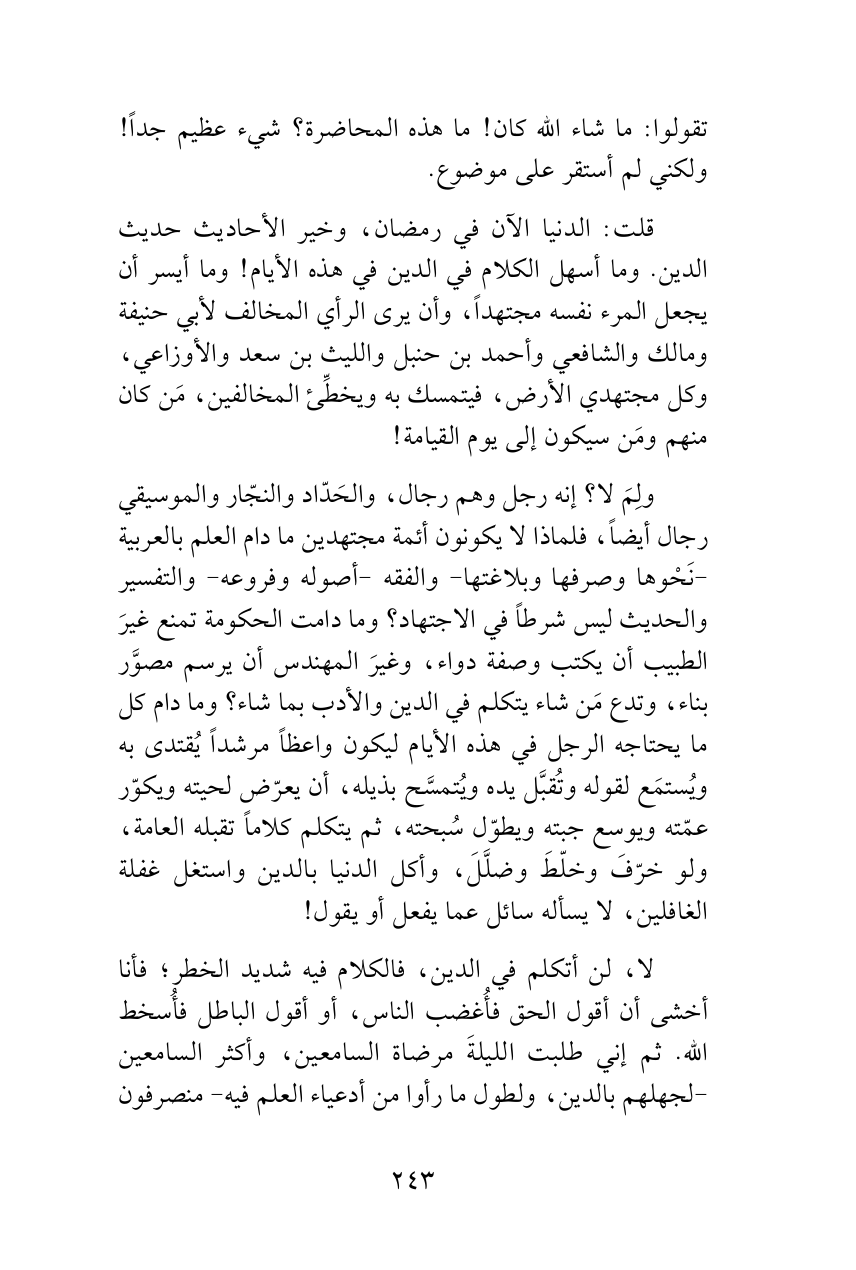 لا، لن أتكلم في الدين، فالكلام فيه شديد الخطر؛ فأنا أخشى أن أقول الحق فأُغضب الناس، أو أقول الباطل فأُسخط الله. ثم إني طلبت الليلةَ مرضاة السامعين، وأكثر السامعين -لجهلهم بالدين، ولطول ما رأوا من أدعياء العلم فيه- منصرفون