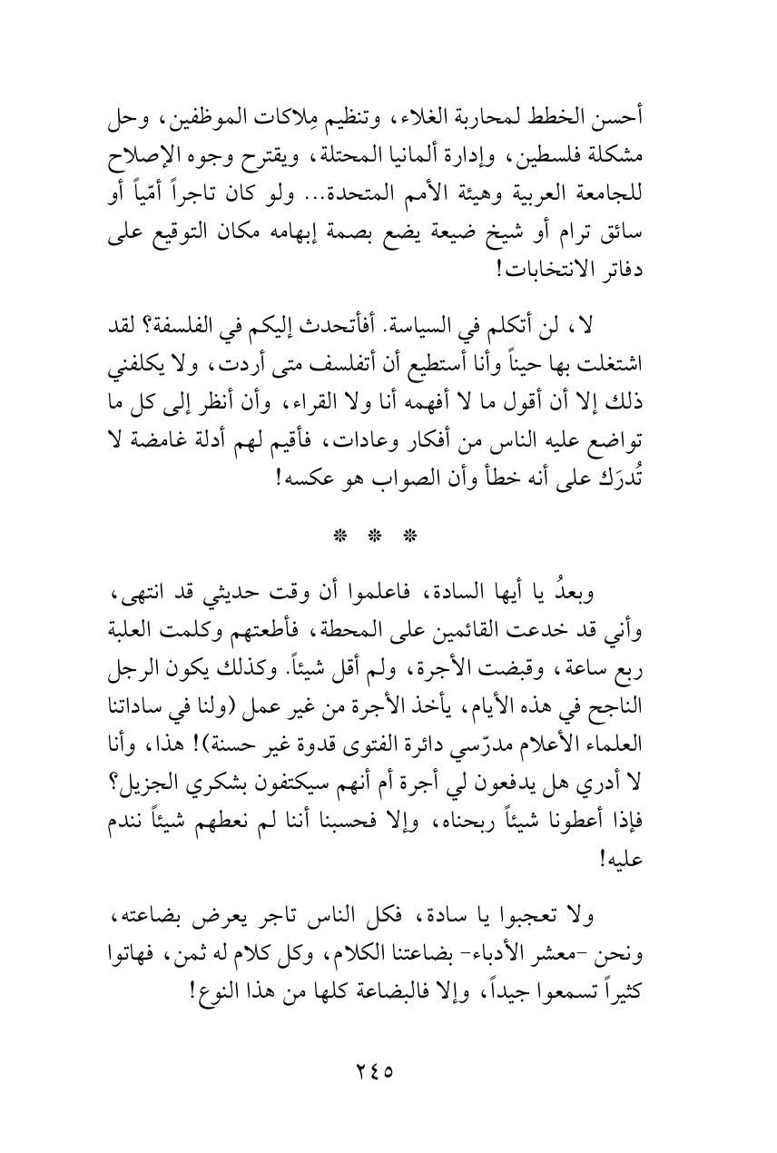 وبعدُ يا أيها السادة، فاعلموا أن وقت حديثي قد انتهى، وأني قد خدعت القائمين على المحطة، فأطعتهم وكلمت العلبة ربع ساعة، وقبضت الأجرة، ولم أقل شيئاً. وكذلك يكون الرجل الناجح في هذه الأيام، يأخذ الأجرة من غير عمل (ولنا في ساداتنا العلماء الأعلام مدرّسي دائرة الفتوى قدوة غير حسنة)! هذا، وأنا لا أدري هل يدفعون لي أجرة أم أنهم سيكتفون بشكري الجزيل؟ فإذا أعطونا شيئاً ربحناه، وإلا فحسبنا أننا لم نعطهم شيئاً نندم عليه!