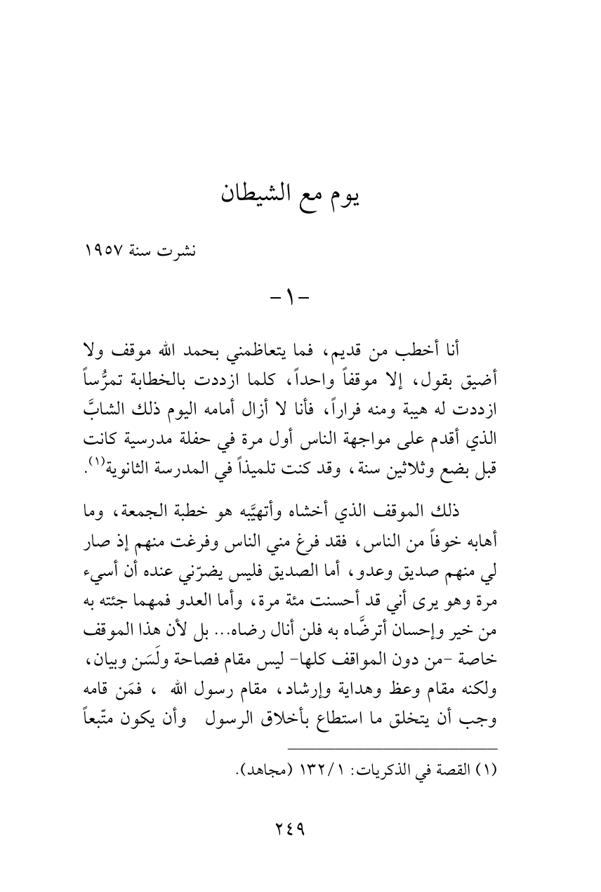 أنا أخطب من قديم، فما يتعاظمني بحمد الله موقف ولا أضيق بقول، إلا موقفاً واحداً، كلما ازددت بالخطابة تمرُّساً ازددت له هيبة ومنه فراراً، فأنا لا أزال أمامه اليوم ذلك الشابَّ الذي أقدم على مواجهة الناس أول مرة في حفلة مدرسية كانت قبل بضع وثلاثين سنة، وقد كنت تلميذاً في المدرسة الثانوية (¬1).