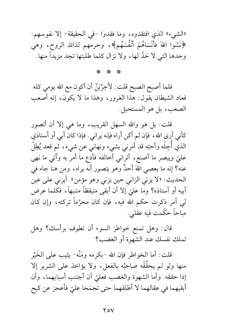فلما أصبح الصبح قلت: لأجرِّبَنَّ أن أكون مع الله يومي كله. فعاد الشيطان يقول: هذا الغرور، وهذا ما لا يكون، إنه أصعب الصعب، بل هو المستحيل.
