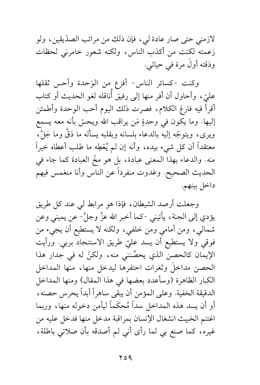 وجعلت أرصد الشيطان، فإذا هو مرابط لي عند كل طريق يؤدي إلى الجنة، يأتيني -كما أخبر الله عزَّ وجلَّ- عن يميني وعن شمالي، ومن أمامي ومن خلفي، ولكنه لا يستطيع أن يجيء من فوقي ولا يستطيع أن يسد عليّ طريق الاستنجاد بربي. ورأيت الإيمان كالحصن الذي يحصِّنني منه، ولكنّ له في جدار هذا الحصن مداخلَ وثغرات احتفرها ليدخل منها، منها المداخل الكبار الظاهرة (وسأعدد بعضها في هذا المقال) ومنها المداخل الدقيقة الخفية. وعلى المؤمن أن يبقى ساهراً أبداً يحرس حصنه، أو أن يسد هذه المداخل سداً مُحكَماً ليأمن دخوله منها، وربما اغتنم الخبيث انشغال الإنسان بمراقبة مدخل منها فدخل عليه من غيره، كما صنع بي لما رأى أني لم أصدقه بأن صلاتي باطلة،