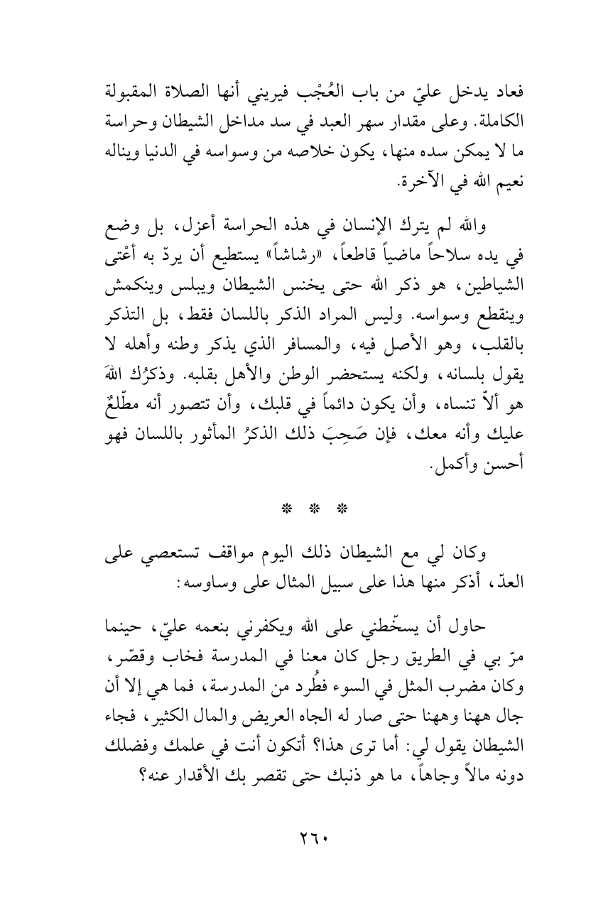 فعاد يدخل عليّ من باب العُجْب فيريني أنها الصلاة المقبولة الكاملة. وعلى مقدار سهر العبد في سد مداخل الشيطان وحراسة ما لا يمكن سده منها، يكون خلاصه من وسواسه في الدنيا ويناله نعيم الله في الآخرة.