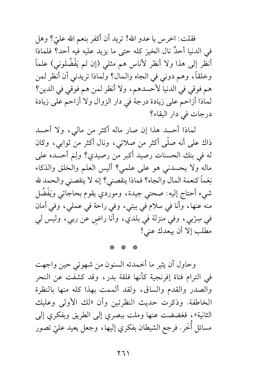 فقلت: اخرس يا عدو الله! تريد أن أكفر بنعم الله عليّ؟ وهل في الدنيا أحدٌ نال الخيرَ كله حتى ما يزيد عليه فيه أحد؟ فلماذا أنظر إلى هذا ولا أنظر لأناس هم مثلي (إن لم يَفْضُلوني) علماً وخلقاً، وهم دوني في الجاه والمال؟ ولماذا تريدني أن أنظر لمن هم فوقي في الدنيا لأحسدهم، ولا أنظر لمن هم فوقي في الدين؟ لماذا أزاحم على زيادة درجة في دار الزوال ولا أزاحم على زيادة درجات في دار البقاء؟