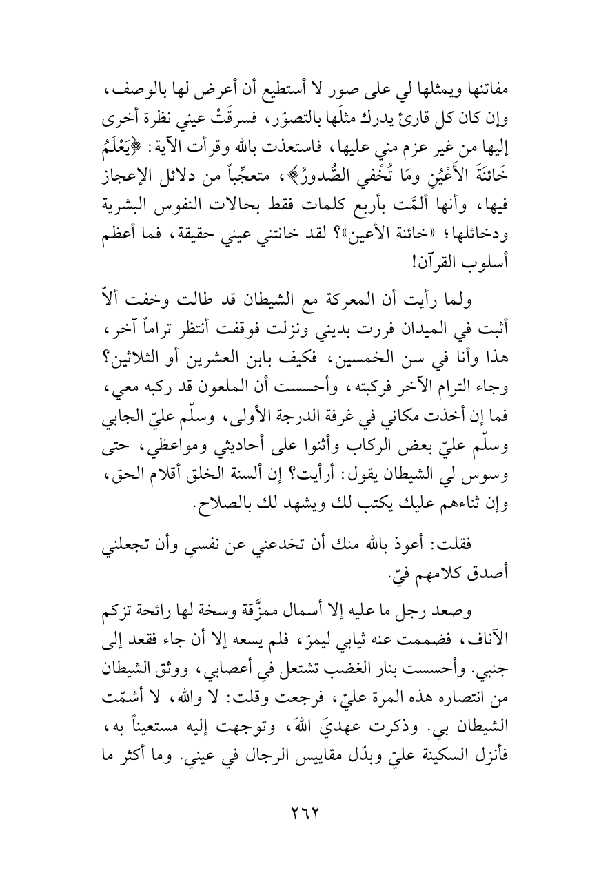 مفاتنها ويمثلها لي على صور لا أستطيع أن أعرض لها بالوصف، وإن كان كل قارئ يدرك مثلَها بالتصوّر، فسرقَتْ عيني نظرة أخرى إليها من غير عزم مني عليها، فاستعذت بالله وقرأت الآية: {يَعْلَمُ خَائنَةَ الأَعْيُنِ ومَا تُخْفي الصُّدورُ}، متعجِّباً من دلائل الإعجاز فيها، وأنها ألمَّت بأربع كلمات فقط بحالات النفوس البشرية ودخائلها؛ «خائنة الأعين»؟ لقد خانتني عيني حقيقة، فما أعظم أسلوب القرآن!