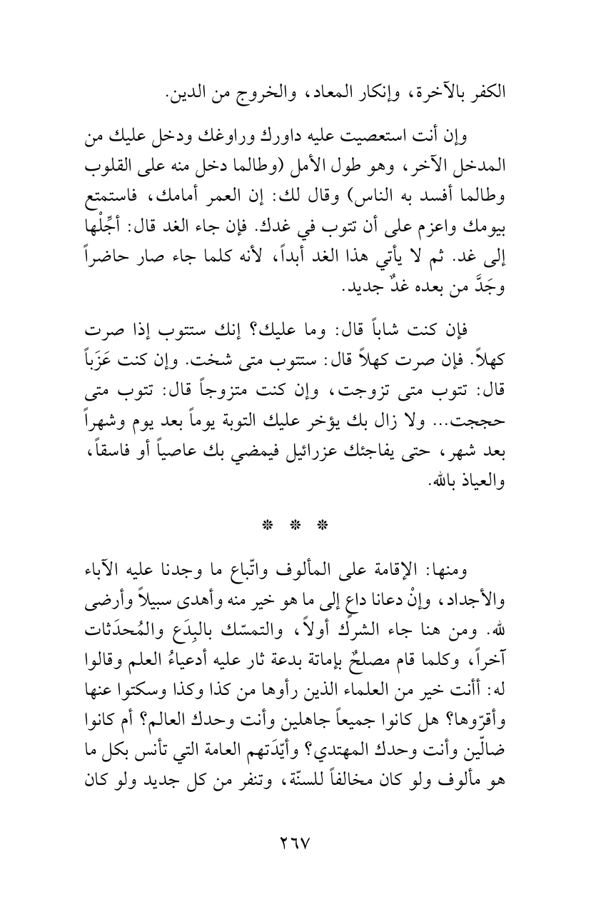وإن أنت استعصيت عليه داورك وراوغك ودخل عليك من المدخل الآخر، وهو طول الأمل (وطالما دخل منه على القلوب وطالما أفسد به الناس) وقال لك: إن العمر أمامك، فاستمتع بيومك واعزم على أن تتوب في غدك. فإن جاء الغد قال: أجِّلْها إلى غد. ثم لا يأتي هذا الغد أبداً، لأنه كلما جاء صار حاضراً وجَدَّ من بعده غدٌ جديد.