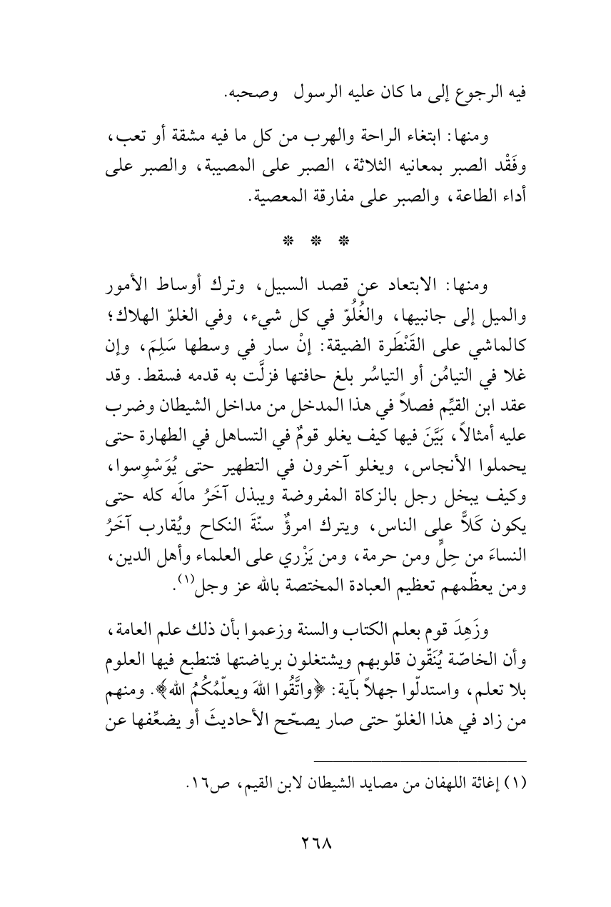 ومنها: الابتعاد عن قصد السبيل، وترك أوساط الأمور والميل إلى جانبيها، والغُلُوّ في كل شيء، وفي الغلوّ الهلاك؛ كالماشي على القَنْطَرة الضيقة: إنْ سار في وسطها سَلِمَ، وإن غلا في التيامُن أو التياسُر بلغ حافتها فزلَّت به قدمه فسقط. وقد عقد ابن القيِّم فصلاً في هذا المدخل من مداخل الشيطان وضرب عليه أمثالاً، بَيَّنَ فيها كيف يغلو قومٌ في التساهل في الطهارة حتى يحملوا الأنجاس، ويغلو آخرون في التطهير حتى يُوَسْوِسوا، وكيف يبخل رجل بالزكاة المفروضة ويبذل آخَرُ مالَه كله حتى يكون كَلاًّ على الناس، ويترك امرؤٌ سنّةَ النكاح ويُقارب آخَرُ النساءَ من حِلٍّ ومن حرمة، ومن يَزْري على العلماء وأهل الدين، ومن يعظّمهم تعظيم العبادة المختصة بالله عز وجل (¬1).