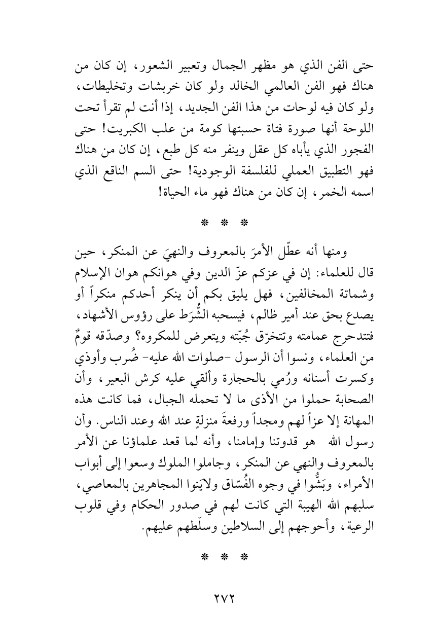 ومنها أنه عطّل الأمرَ بالمعروف والنهيَ عن المنكر، حين قال للعلماء: إن في عزكم عزّ الدين وفي هوانكم هوان الإسلام وشماتة المخالفين، فهل يليق بكم أن ينكر أحدكم منكراً أو يصدع بحق عند أمير ظالم، فيسحبه الشُّرَط على رؤوس الأشهاد، فتتدحرج عمامته وتتخرّق جُبّته ويتعرض للمكروه؟ وصدّقه قومٌ من العلماء، ونسوا أن الرسول -صلوات الله عليه- ضُرب وأوذي وكسرت أسنانه ورُمي بالحجارة وألقي عليه كرش البعير، وأن الصحابة حملوا من الأذى ما لا تحمله الجبال، فما كانت هذه المهانة إلا عزاً لهم ومجداً ورفعةَ منزلةٍ عند الله وعند الناس. وأن رسول الله صلى الله عليه وسلم هو قدوتنا وإمامنا، وأنه لما قعد علماؤنا عن الأمر بالمعروف والنهي عن المنكر، وجاملوا الملوك وسعوا إلى أبواب الأمراء، وبَشُّوا في وجوه الفُسّاق ولايَنوا المجاهرين بالمعاصي، سلبهم الله الهيبة التي كانت لهم في صدور الحكام وفي قلوب الرعية، وأحوجهم إلى السلاطين وسلّطهم عليهم.