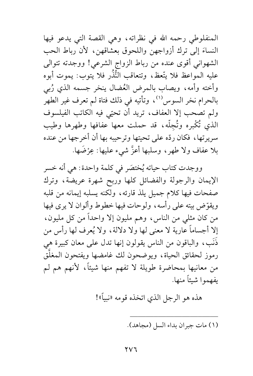 المنفلوطي رحمه الله في نظراته، وهي القصة التي يدعو فيها النساءَ إلى ترك أزواجهن واللحوق بعشاقهن، لأن رباط الحب الشهواني أقوى عنده من رباط الزواج الشرعي! ووجدته تتوالى عليه المواعظ فلا يتّعظ، وتتعاقب النُّذُر فلا يتوب: يموت أبوه وأخته وأمه، ويصاب بالمرض العُضال ينخر جسمه الذي رُبي بالحرام نخر السوس (¬1)، وتأتيه في ذلك فتاة لم تعرف غير الطهر ولم تصحب إلا العفاف، تريد أن تحيّي فيه الكاتب الفيلسوف الذي تُكْبره وتُجِلّه، قد حملت معها عفافها وطهرها وطيب سريرتها، فكان ردّه على تحيتها وترحيبه بها أن أخرجها من عنده بلا عفاف ولا طهر، وسلبها أعزَّ شيء عليها: عِرْضَها.