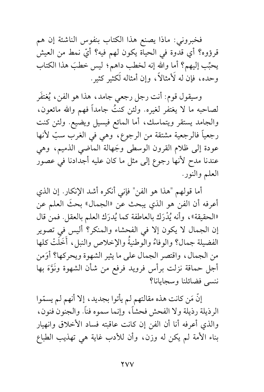 وسيقول قوم: أنت رجل رجعي جامد، هذا هو الفن، يُغتفَر لصاحبه ما لا يغتفر لغيره. ولئن كنتُ جامداً فهم والله مائعون، والجامد يستقر ويتماسك، أما المائع فيسيل ويضيع. ولئن كنت رجعياً فالرجعية مشتقة من الرجوع، وهي في الغرب سبّ لأنها عودة إلى ظلام القرون الوسطى وجَهالة الماضي الذميم، وهي عندنا مدح لأنها رجوع إلى مثل ما كان عليه أجدادنا في عصور العلم والنور.