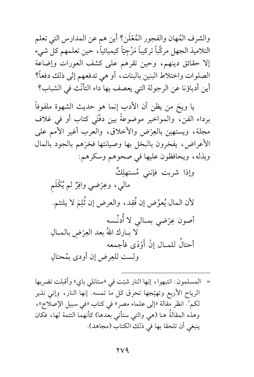 والشرف المُهان والفجور المُعْلَن؟ أين هم عن المدارس التي تعلم التلاميذ الجهل مركَّباً تركيباً مَزْجِيّاً كيميائياً، حين تعلمهم كل شيء إلا حقائق دينهم، وحين تقرهم على كشف العورات وإضاعة الصلوات واختلاط البنين بالبنات، أو هي تدفعهم إلى ذلك دفعاً؟ أين أدباؤنا عن الرجولة التي يعصف بها داء التأنّث في الشباب؟