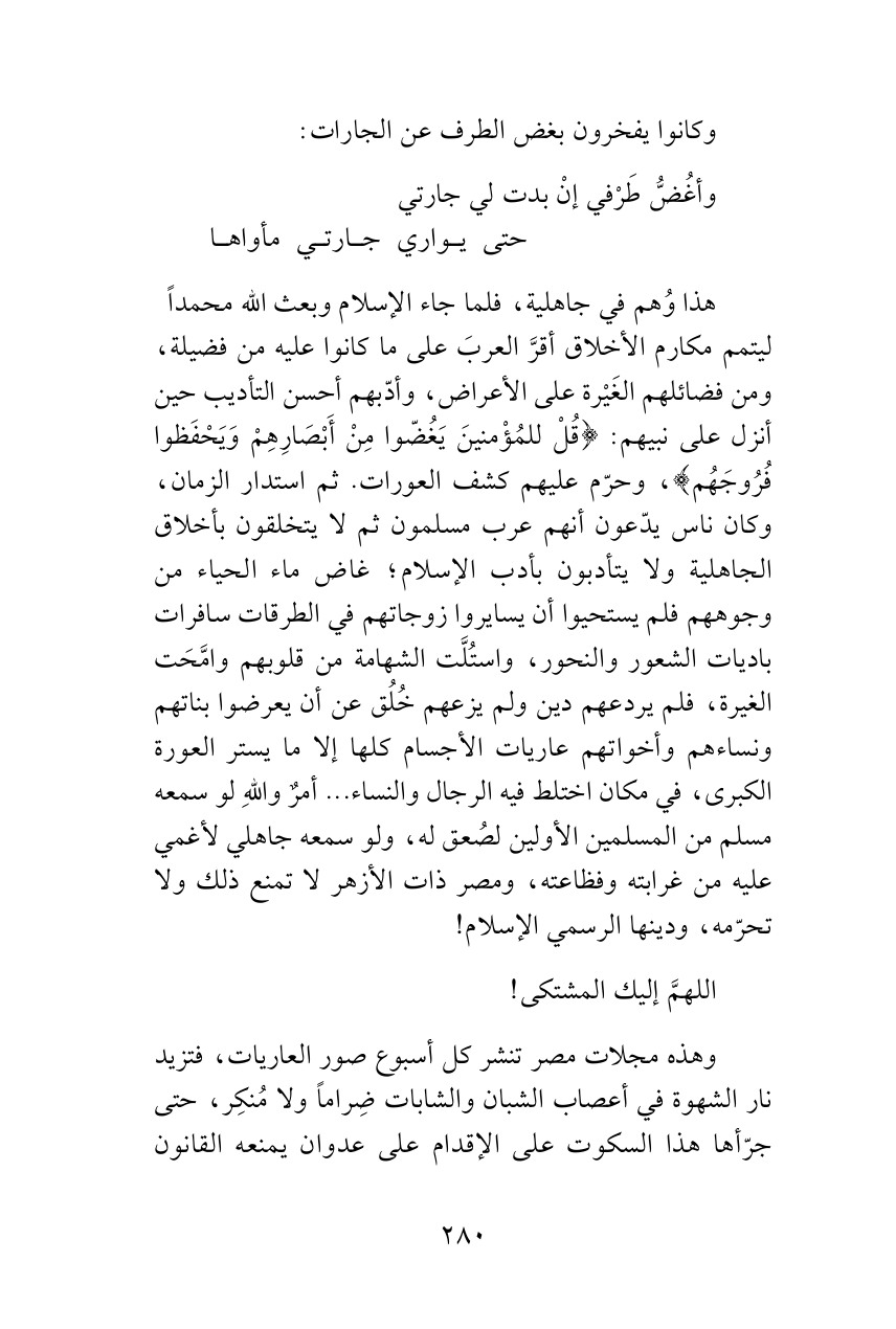 هذا وُهم في جاهلية، فلما جاء الإسلام وبعث الله محمداً صلى الله عليه وسلم ليتمم مكارم الأخلاق أقرَّ العربَ على ما كانوا عليه من فضيلة، ومن فضائلهم الغَيْرة على الأعراض، وأدّبهم أحسن التأديب حين أنزل على نبيهم: {قُلْ للمُؤْمنينَ يَغُضّوا مِنْ أَبْصَارِهِمْ وَيَحْفَظوا فُرُوجَهُم}، وحرّم عليهم كشف العورات. ثم استدار الزمان، وكان ناس يدّعون أنهم عرب مسلمون ثم لا يتخلقون بأخلاق الجاهلية ولا يتأدبون بأدب الإسلام؛ غاض ماء الحياء من وجوههم فلم يستحيوا أن يسايروا زوجاتهم في الطرقات سافرات باديات الشعور والنحور، واستُلَّت الشهامة من قلوبهم وامَّحَت الغيرة، فلم يردعهم دين ولم يزعهم خُلُق عن أن يعرضوا بناتهم ونساءهم وأخواتهم عاريات الأجسام كلها إلا ما يستر العورة الكبرى، في مكان اختلط فيه الرجال والنساء ... أمرٌ واللهِ لو سمعه مسلم من المسلمين الأولين لصُعق له، ولو سمعه جاهلي لأغمي عليه من غرابته وفظاعته، ومصر ذات الأزهر لا تمنع ذلك ولا تحرّمه، ودينها الرسمي الإسلام!